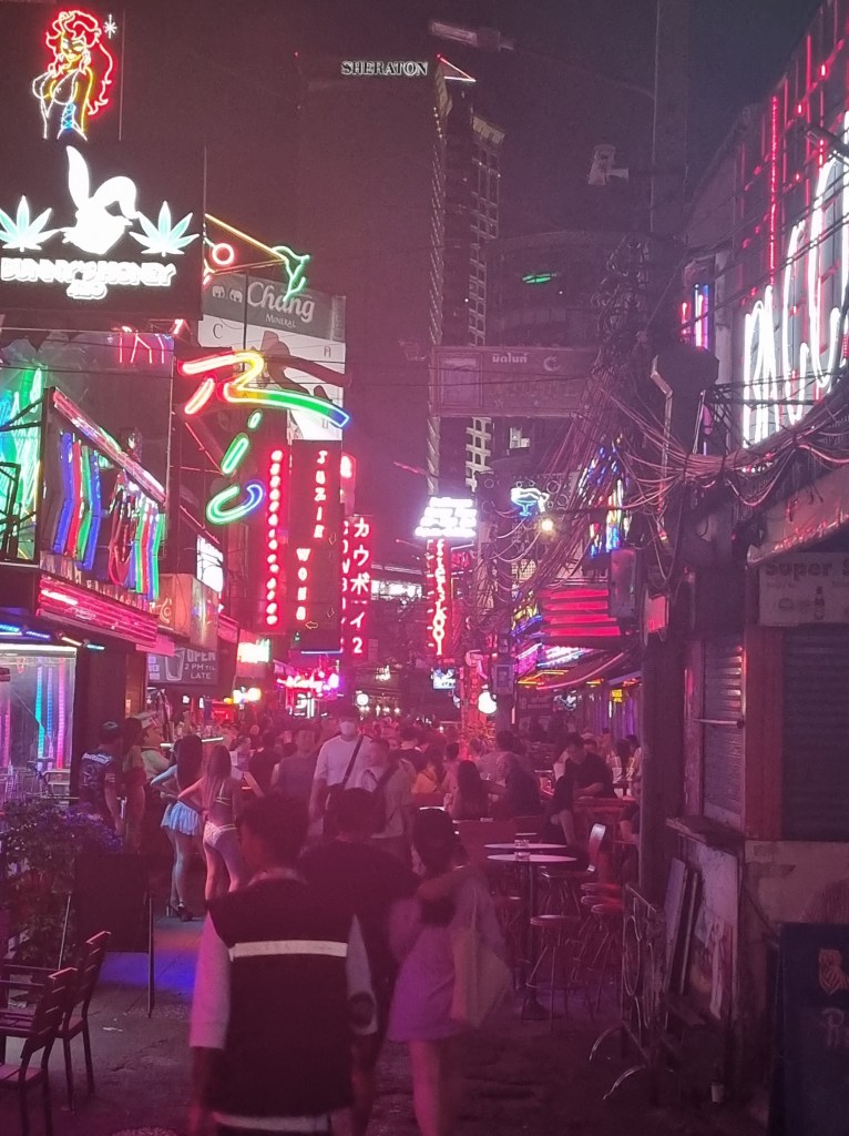 En la noche fui a cenar delis con dos gringos y una francesa que conocí en el hostal. Llevaba muchos días de ermitaña y un poco de convivencia no me cayó mal. Después fuimos por un drink a una calle a la que nunca hubiera ido sola (de hecho en mi mapa la tengo marcada como “no ir”). Se llama Soi Cowboy, que es la decadente calle donde hombres blancos de mediana edad buscan a los famosos ladyboys… Decadente pero interesante y la estética del lugar, entre letreros neón futuristas, era de no creerse.