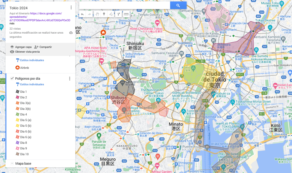 Lugares visitados: Mirador de la Torre Metropolitana, Roppongi y tarde libre por Shibuya/Harajuku. Color en el mapa: naranja