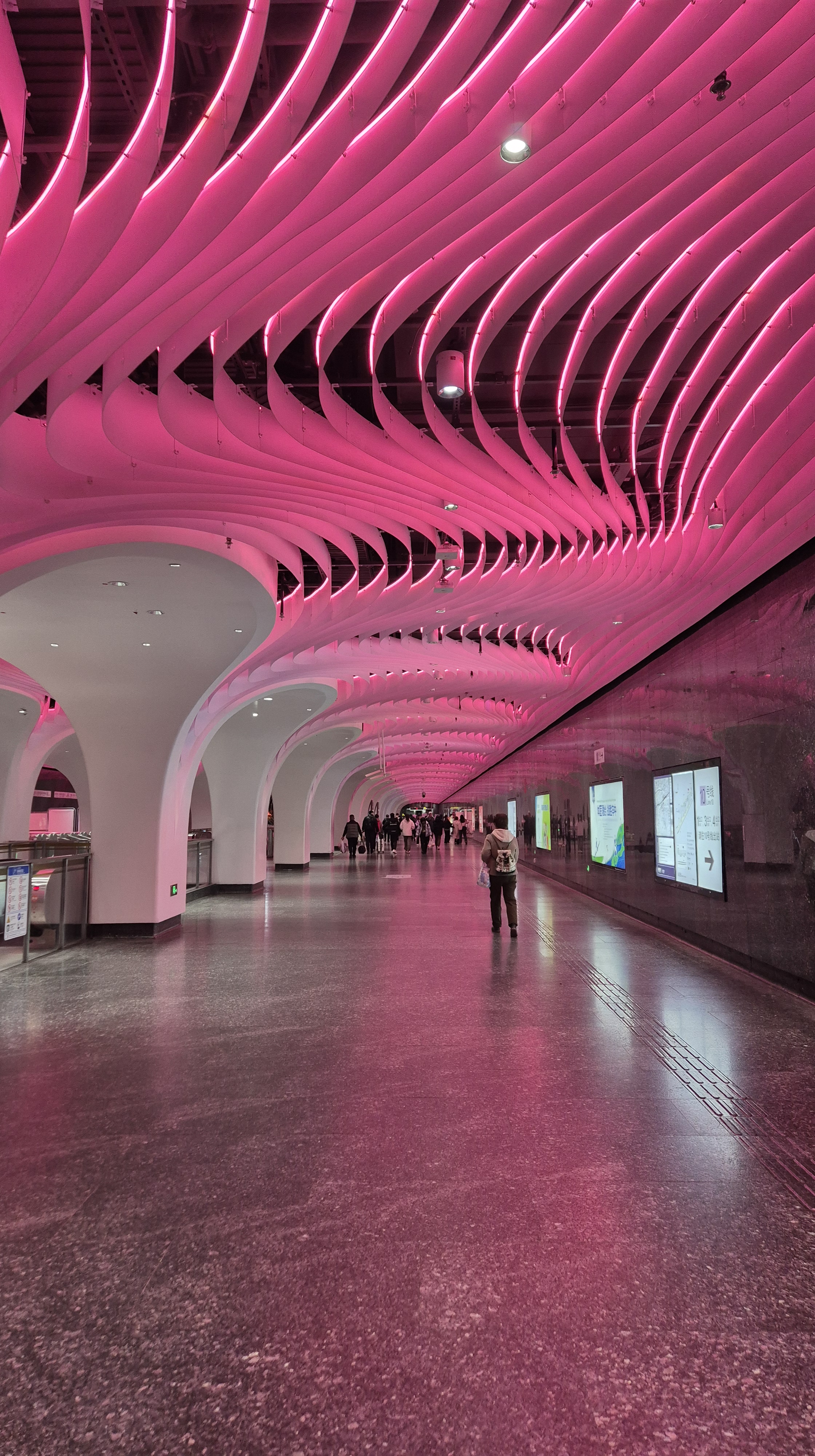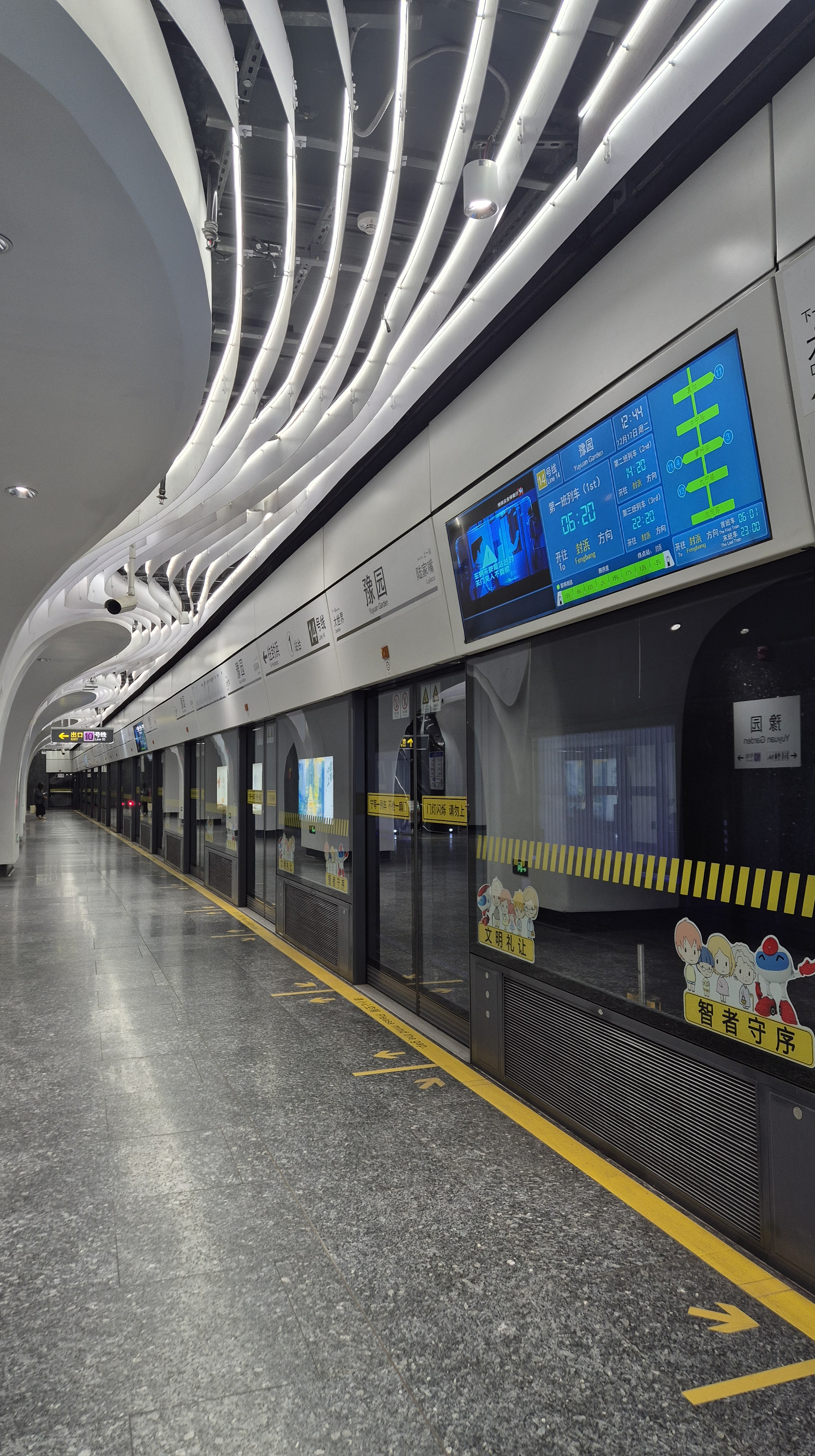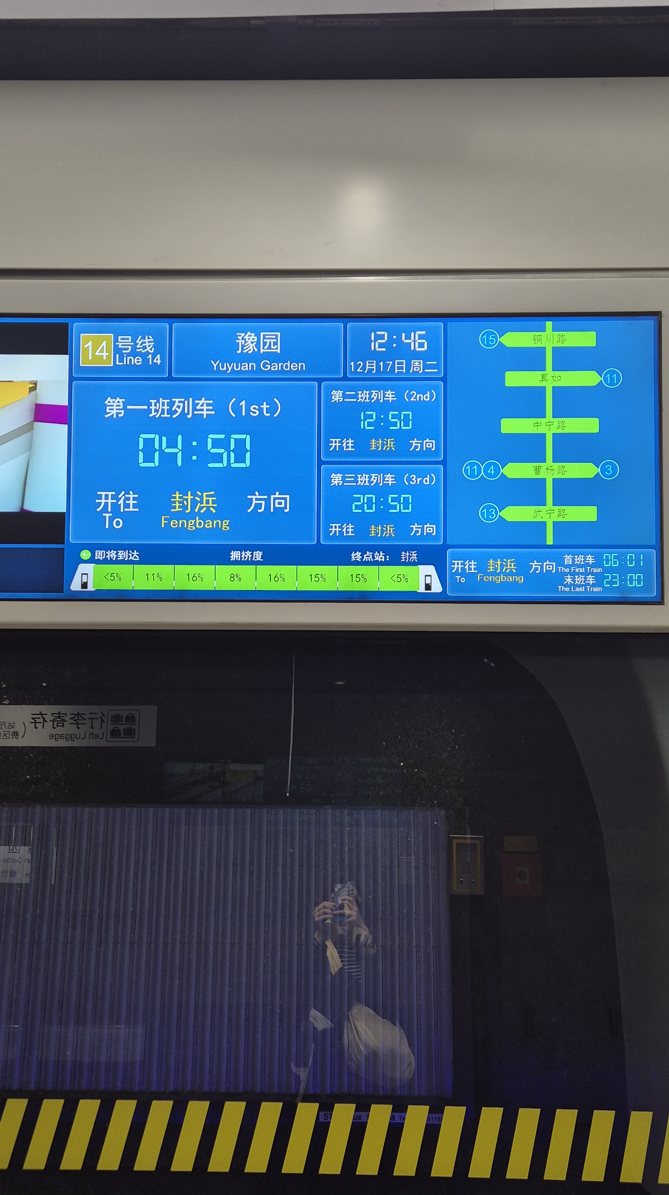 Finalmente llegué a Yuyuan Garden un lugar -que era mi punto de destino y había visto en las guías y demás- que sí es medio un tourist trap (o no, depende cómo disfrute uno viajar). Al parecer era un templo importante pero está ultra remodelado y literalmente es un centro comercial de souvenirs (me fui rapidito la verdad). Además del templo, me interesaba ir a esa zona porque quería visitar la línea 14 de metro, una de las más nuevas (bueno, ya van en la 22) que es de verdad una locura. Además de tener reconocimientos por su arquitectura, tiene una tecnología fuera de este mundo (vean la foto de la pantalla que indica en cuánto llega el tren y qué tan lleno va). El resto de las líneas de metro están perfecto, pero son más normales en el sentido del diseño.