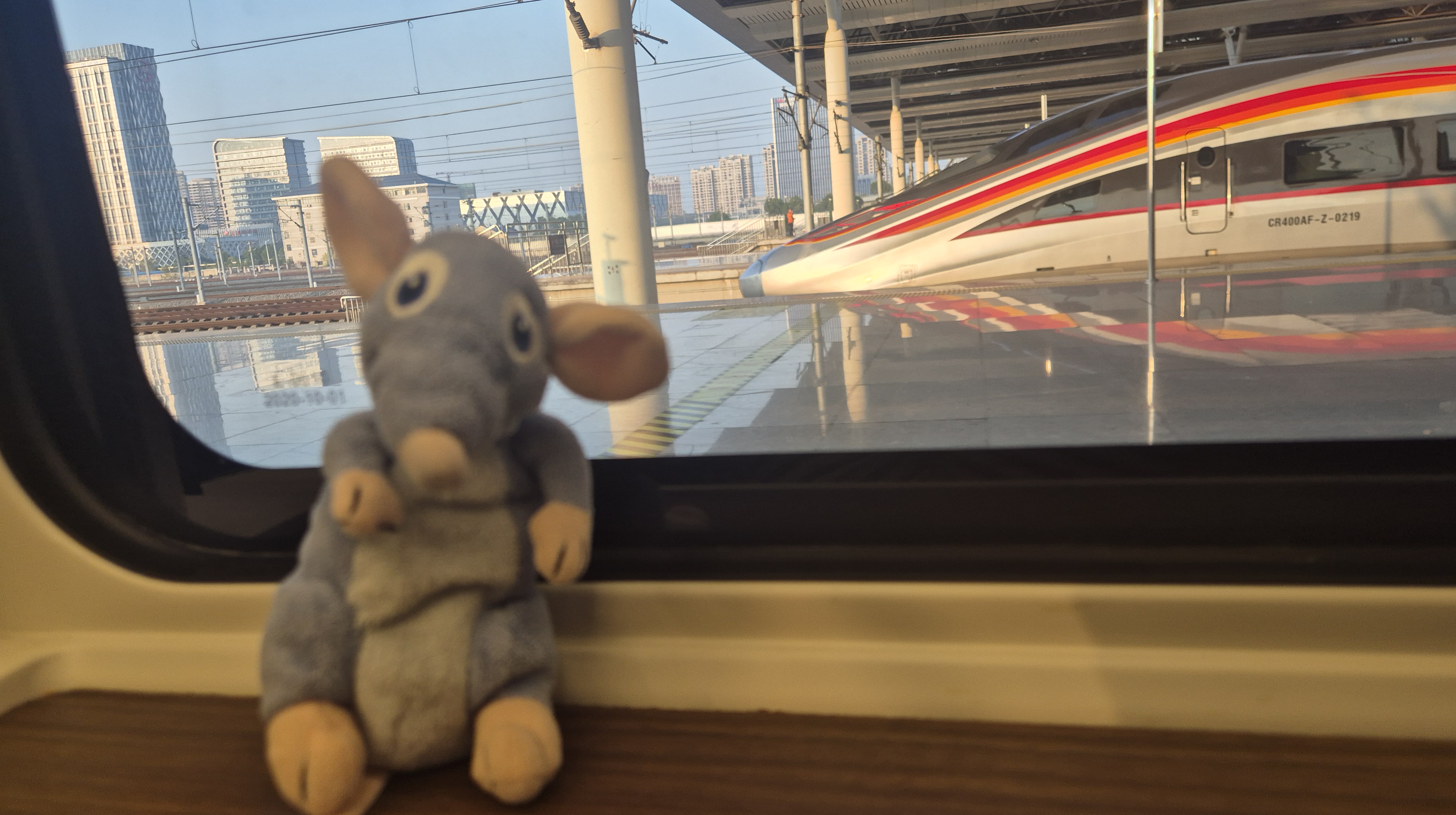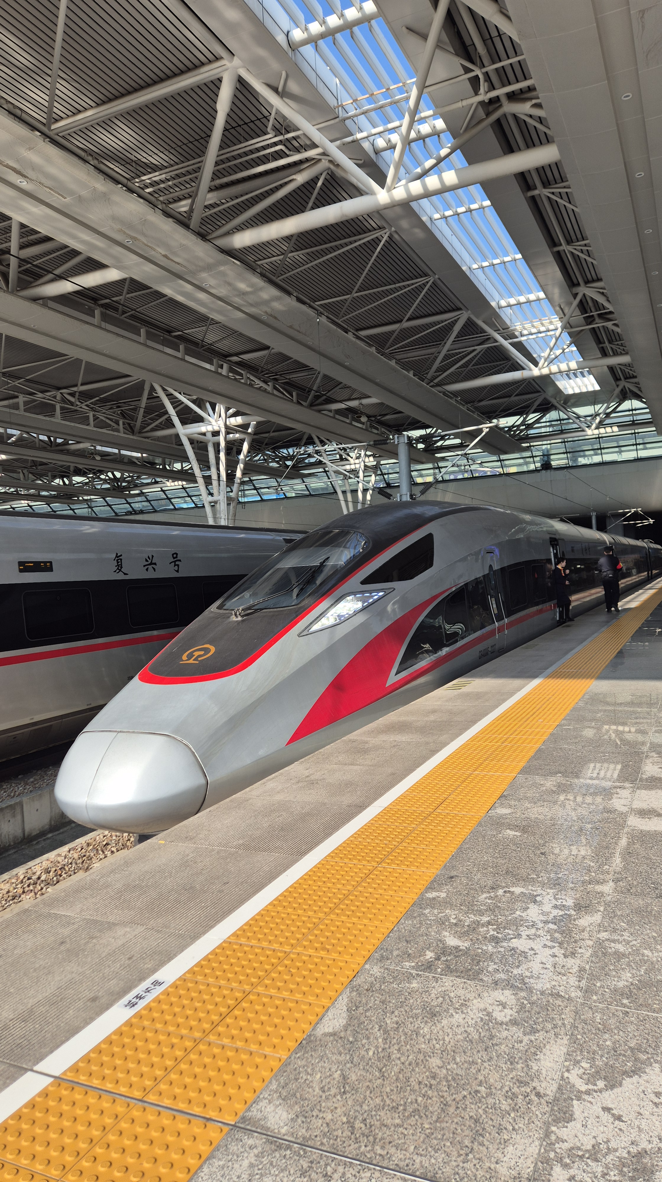 El tren es una belleza, era un línea G, que son la última generación y van hasta 350 km/h (en mi recorrido casi todo el tiempo entre estaciones fue a 305km/h). Por dentro están perfecto, aunque sí freseé y me fui en primera (aunque normal igual está muy bien, solo un poco más apretado, y todavía tienen medio vagón business que es más fancy). Poca gente recorre las 10 horas, iban subiendo y bajando, y a pesar de la velocidad no llegué más rápido porque fueron 20 paradas ya que es una ruta de conexión, hay otras más enfocadas en eficiencia: tienen una ruta de Beijing a Shanghái directa (o casi) que recorres 1350 km en 4 horas 20 minutos.