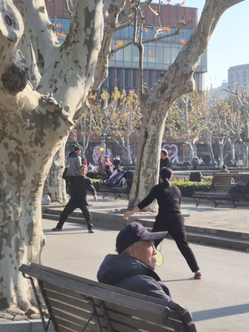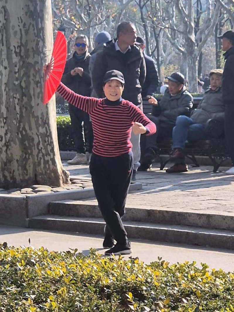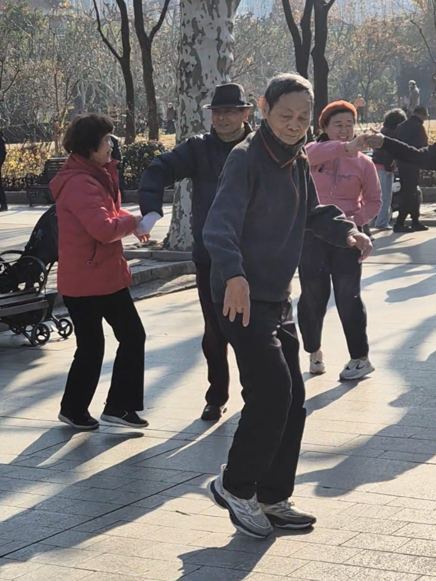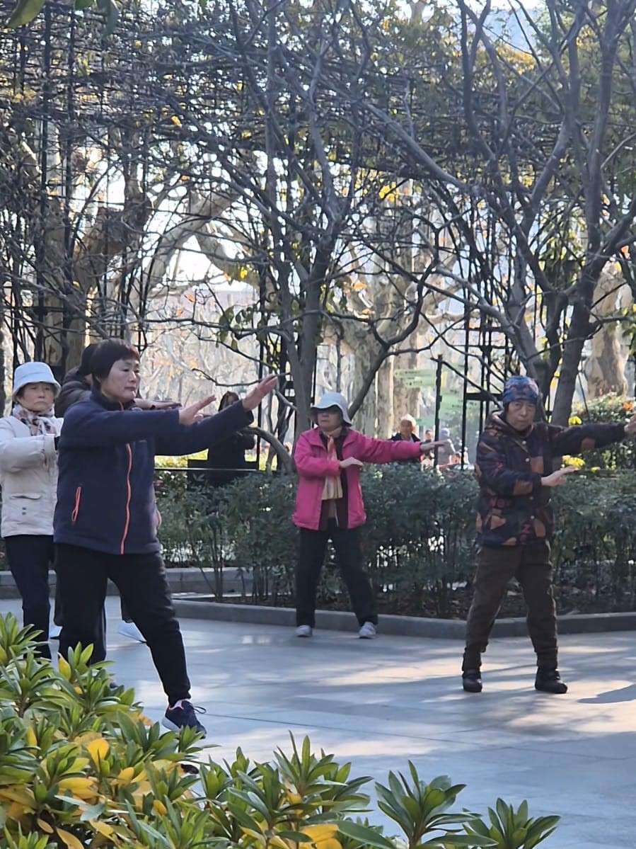 Salí a tomar mi, ya clásico, cafecito mañanero con croissant de pimienta de Sichuán y a caminar por mi colonia para despedirme de sus calles, arbolitos, gente en bici y cafés (aunque los últimos días me quedo en otro cacho de la misma zona -es enorme-). Mi caminata me llevó de vuelta al parque que me enseñó Nacho el primer día, y donde me había recomendado ir en la mañana para ver a los viejitos. Recuerdo en mi primera visita a China que “los viejitos en los parques” me habían llamado mucho la atención, pero creo que sí era mucho más joven y la vejez no era un tema que me preocupaba (no tanto la mía, que sigo joven, pero sí de mis seres queridos que en ese entonces todavía se veía como algo extremadamente lejano). Esta vez me pareció verdaderamente conmovedor.