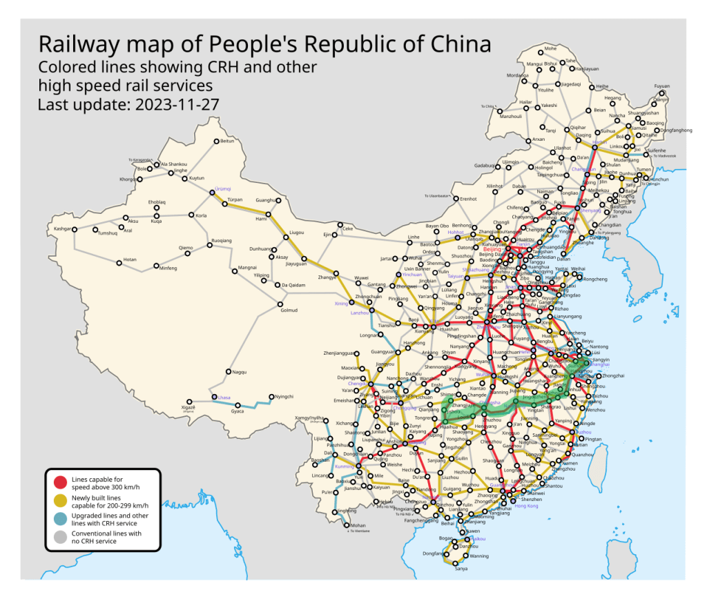 Pausa para hablar de trenes: la red de trenes alta velocidad (200 a 350 km/hr) de China pasó de 8, 000 km en 2008 a 45,000 km en 2023. Conecta 32 de las 33 provincias. Revisando un poco los números, transporta 3.8 mil millones de pasajeros al año y es la red de trenes más segura del mundo – en 2011 tuvieron un accidente y se metieron hasta la cocina a arreglar el sistema-. Obvio es eléctrica y cada día están innovando, y ahora están por lanzar (¿2025?) un tren que va a 600km/hr.