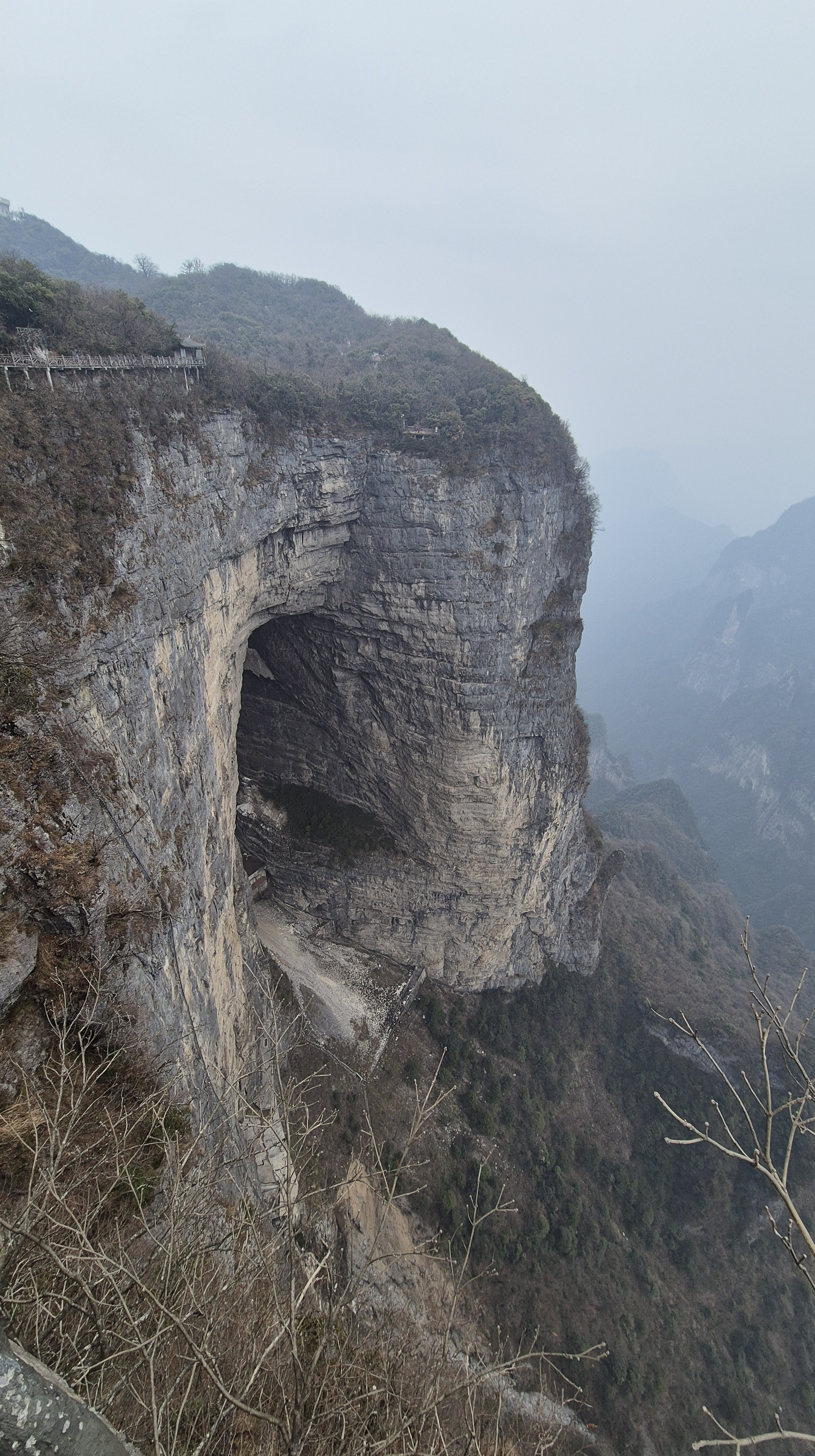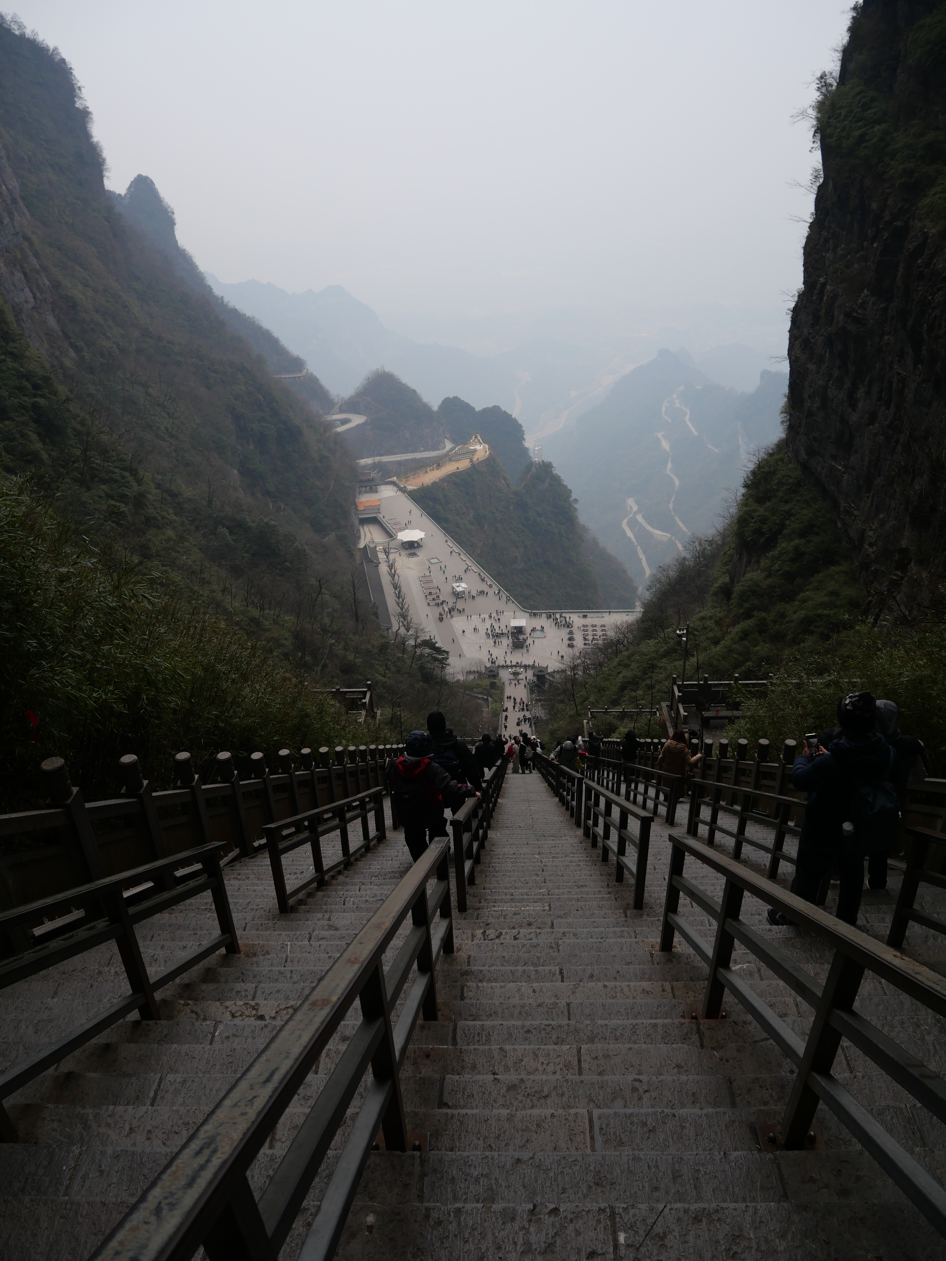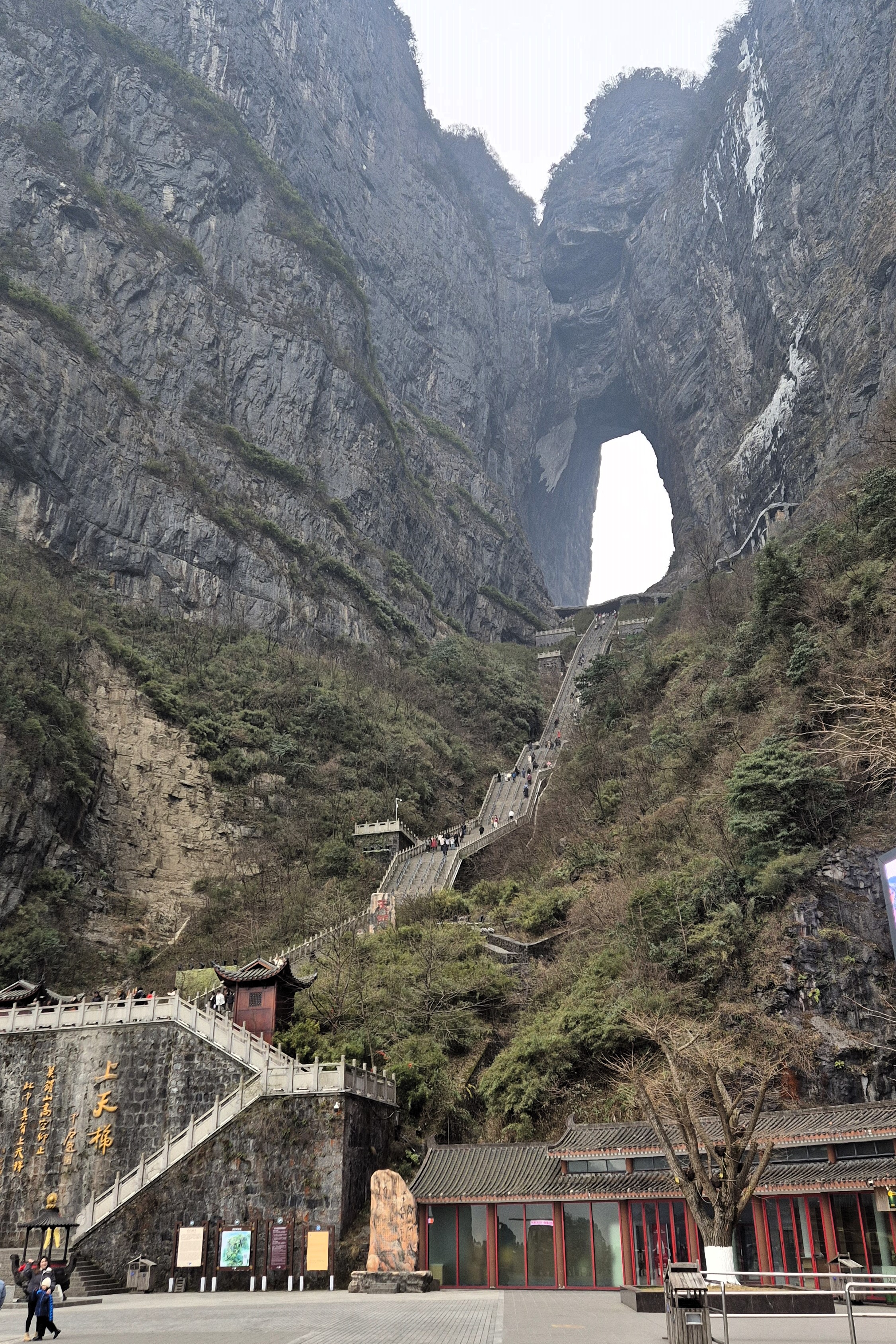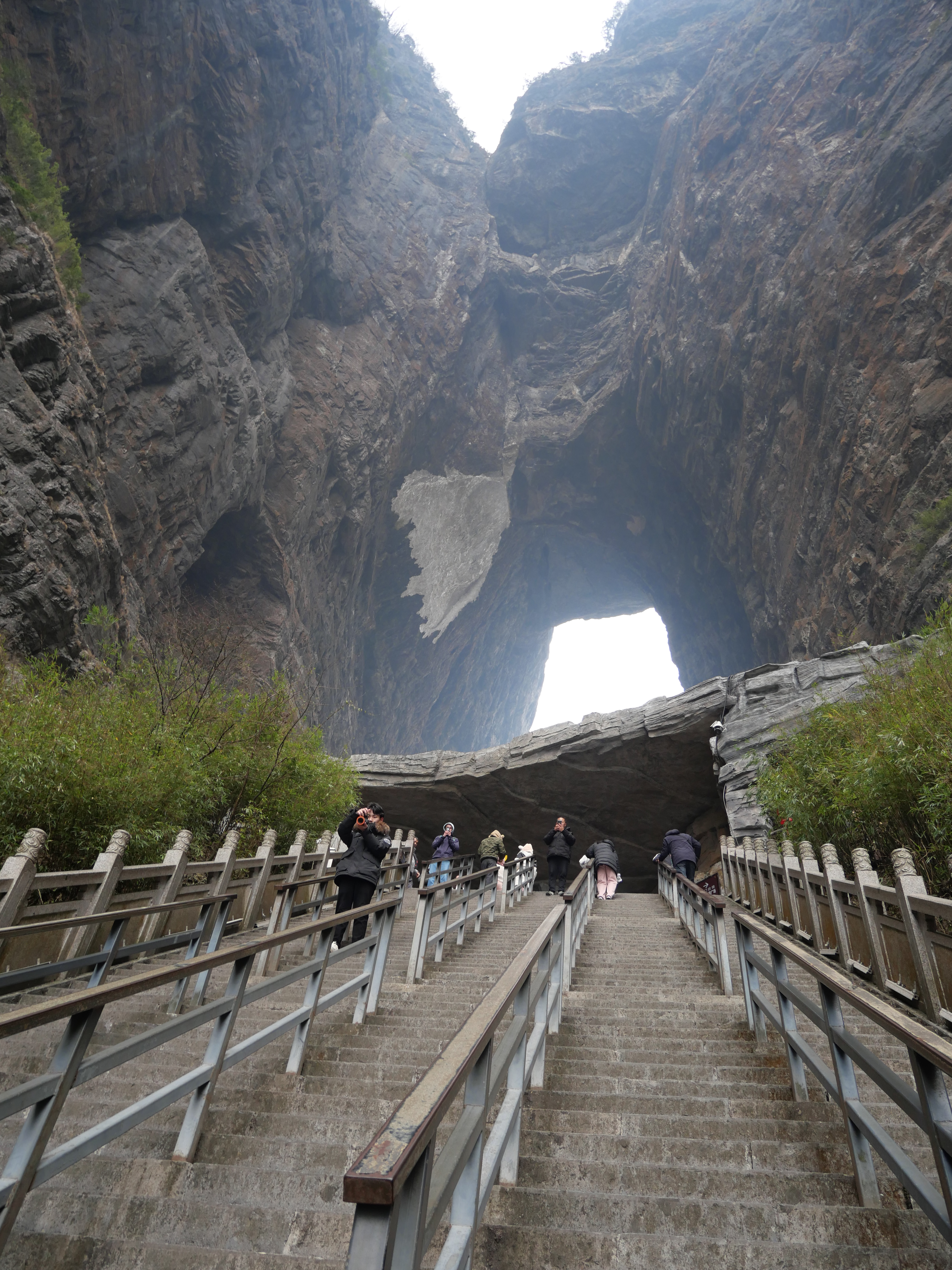 La montaña tiene un arco/agujero de 130 metros (Tianmen Cave) que le da el nombre de Puerta al cielo. La escalera te deja en el punto donde comienza el arco y ahí hay unas escaleras (999) que bajan a un punto intermedio en la montaña (al parecer, también hay un elevador adentro de la montaña por si no quieres/puedes bajar 999 escalones, ¡ya ahí nada me sorprendía!). Bajarlas no fue menor, más que ya había recorrido toda la montaña, pero valió infinitamente la pena (hay gente que las sube, ya que hay distintas rutas y recorridos en la montaña, el que me recomendaron me pareció sensacional).