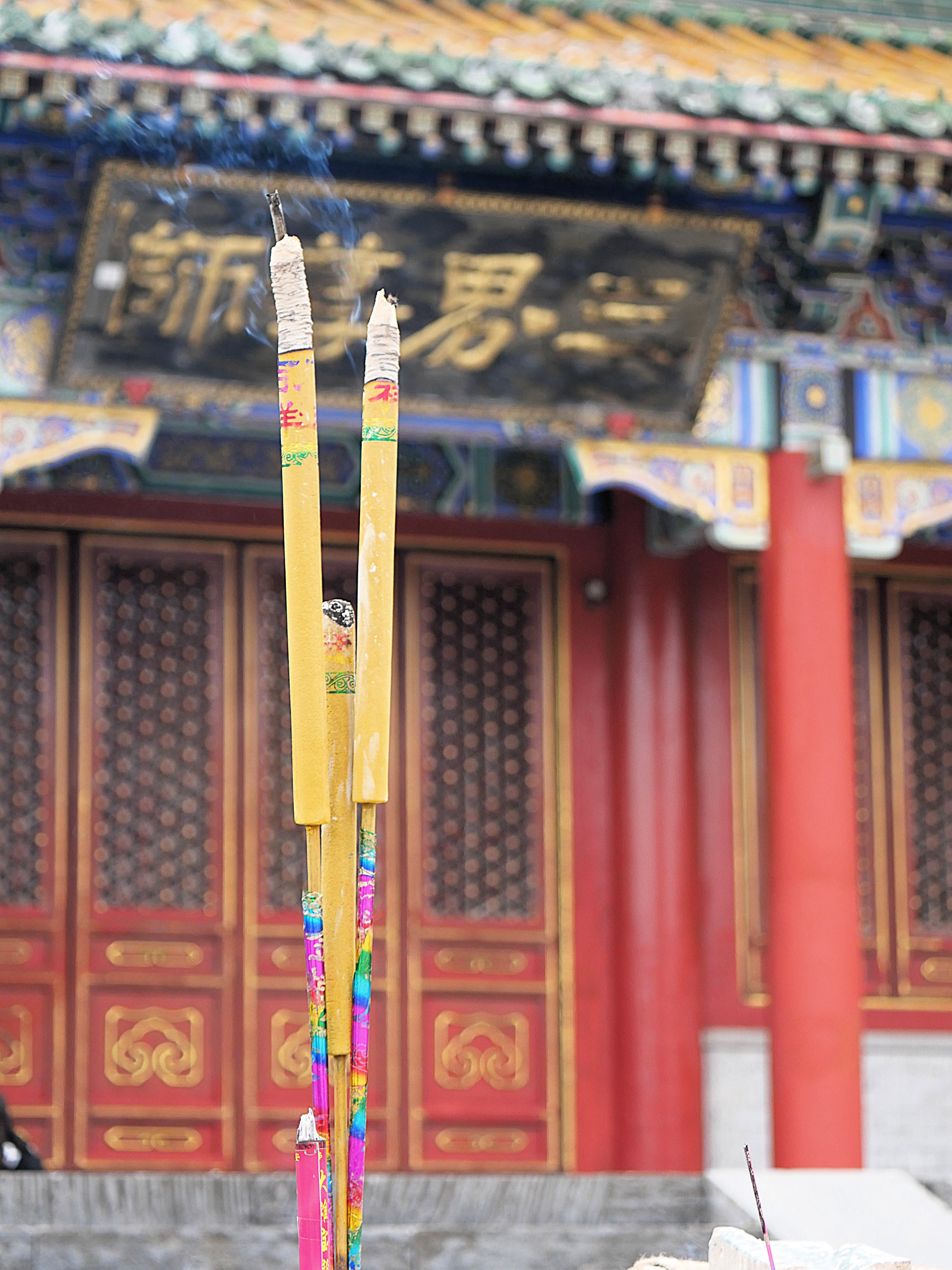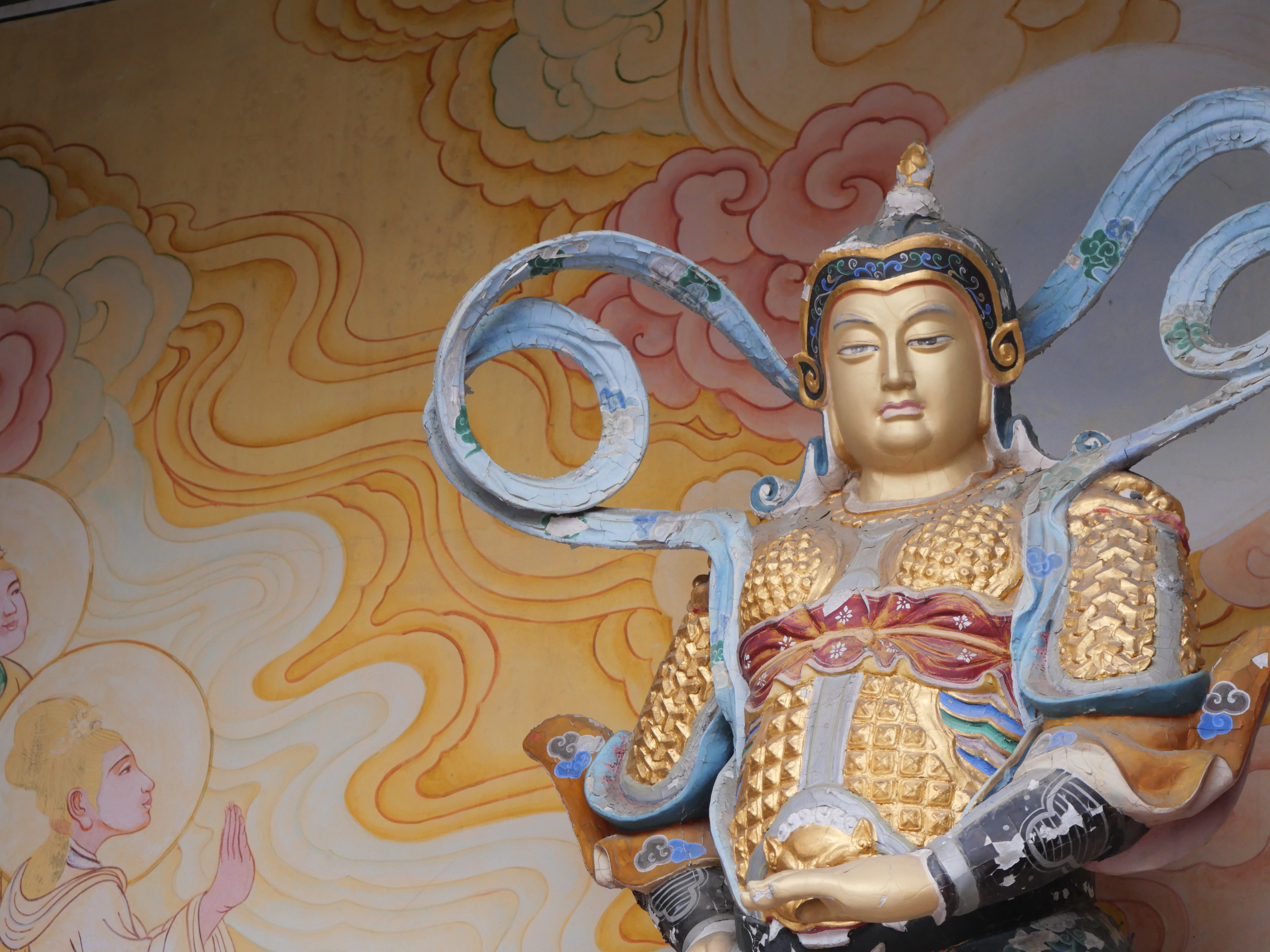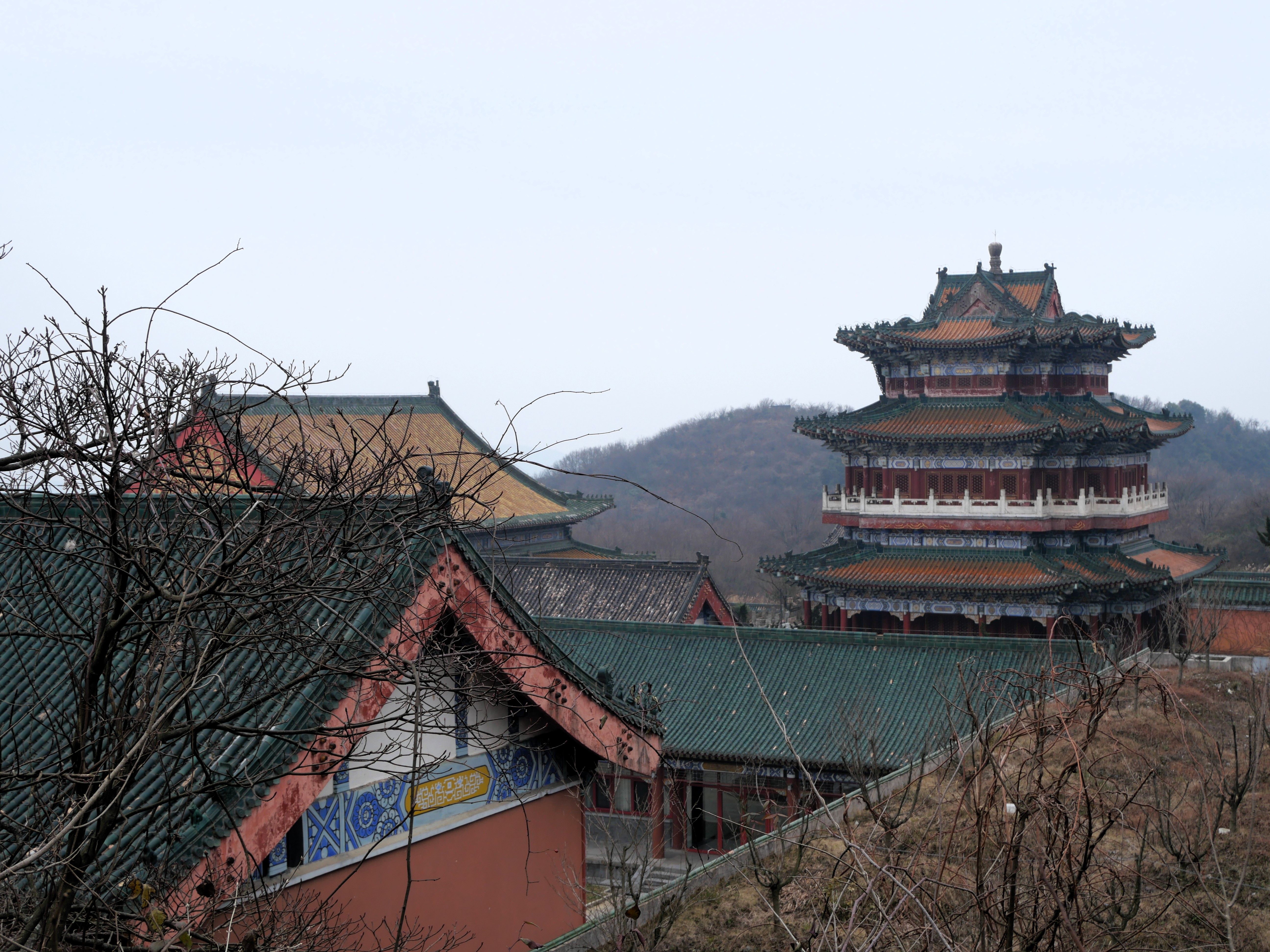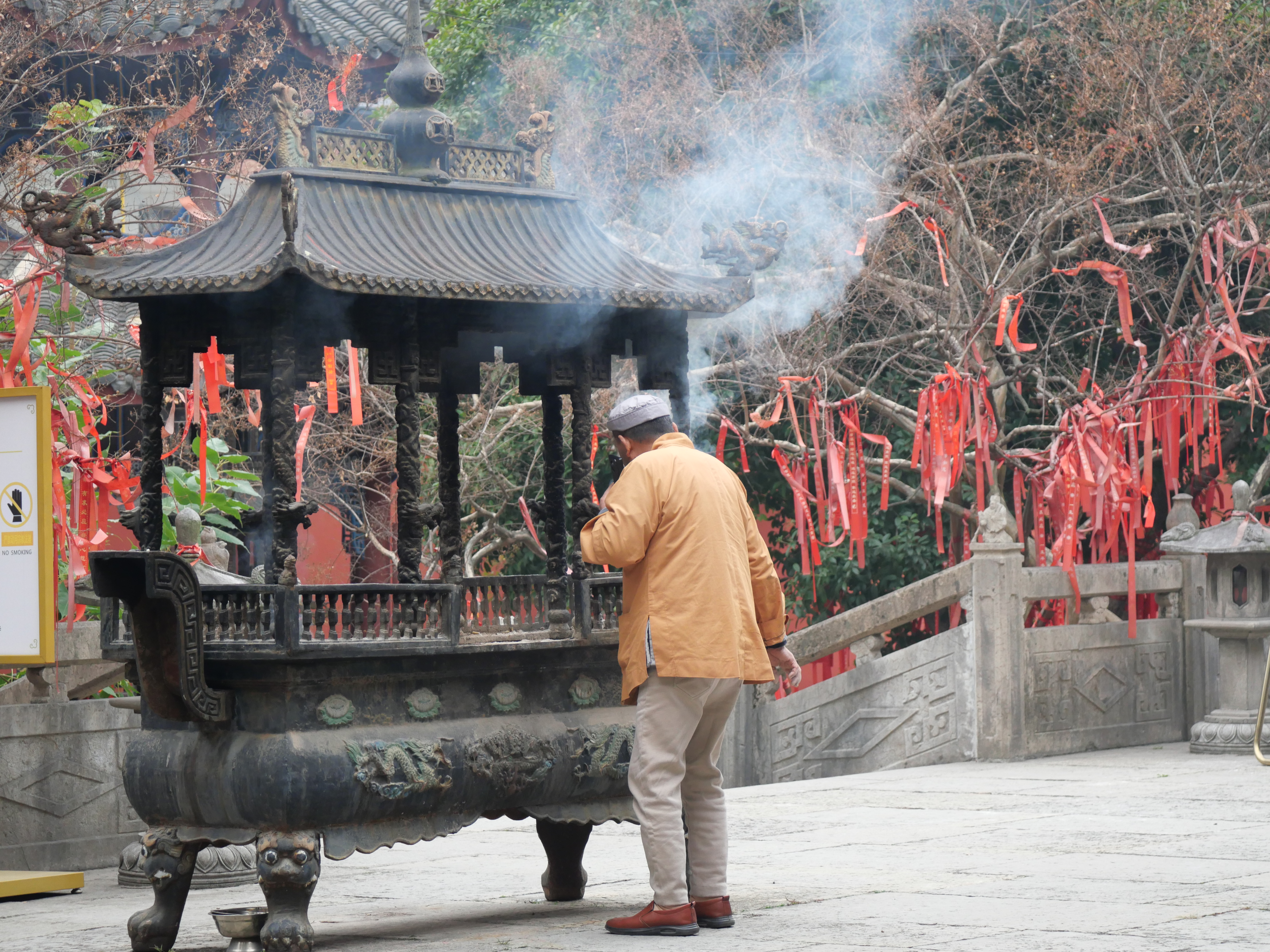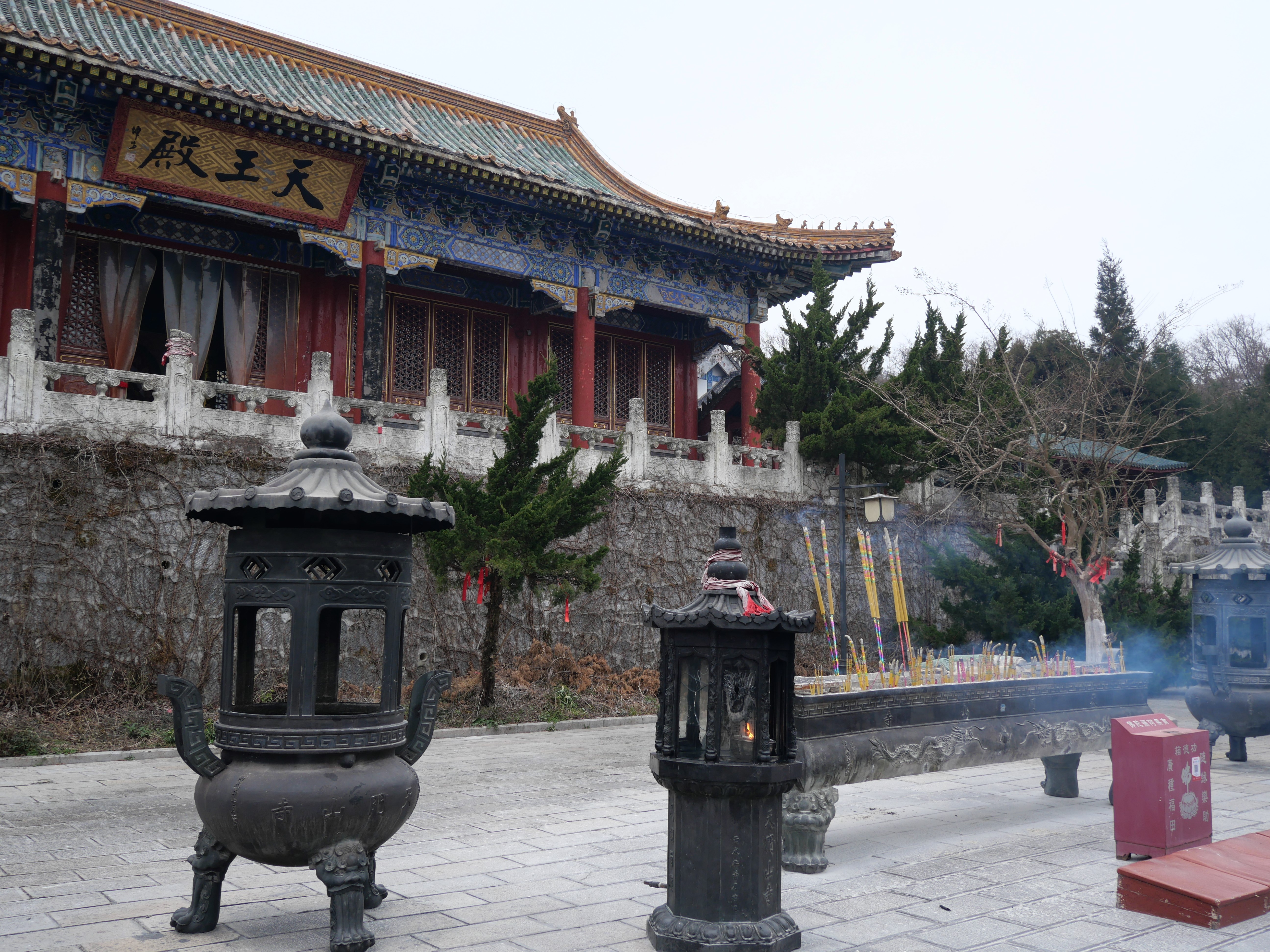 Varios kilómetros de recorrido por estas rutas (muy extraño, todo está súper señalizado menos la distancia) llegué al templo y ¡qué lugar! Los templos budistas en China tienen ciertos detalles estéticos que son nuevos para mí y me fascinan. El uso de azules y muchos remates y detallitos, pero sin llegar a la atascadés dorada de otras culturas budistas. Habíamos muy pocas personas, hacía un frío de locos y con las nubes todo daba una sensación bastante eerie. Hermoso.