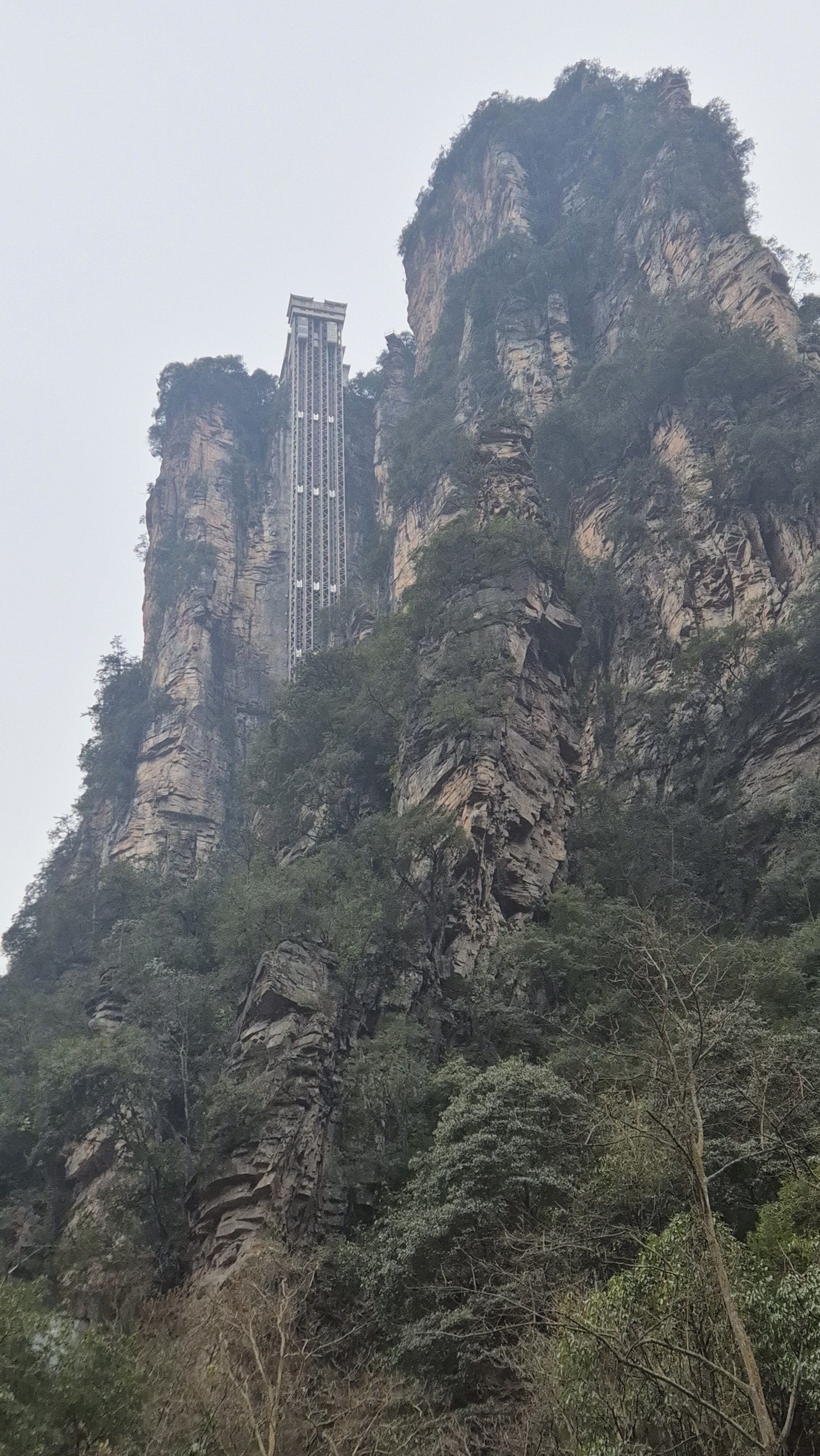 Claramente los chinos, siendo ellos, no se iban a quedar con una ruta de camioncitos funcional y ya. Al igual que la montaña de Tianmen, estas montañas tienen grandes acantilados y pilares, y es muy difícil subir de la manera tradicional. Para solucionar este “problemita” se ingeniaron una de las cosas más cool que he visto: ¡un elevador exterior que te sube a la montaña! (nunca subo videos al blog -hay que subirlos a YouTube y demás- pero esto sí amerita, tarda un rato en empezar pero es parte del chiste). El elevador sube 326 metros en un minuto y medio.