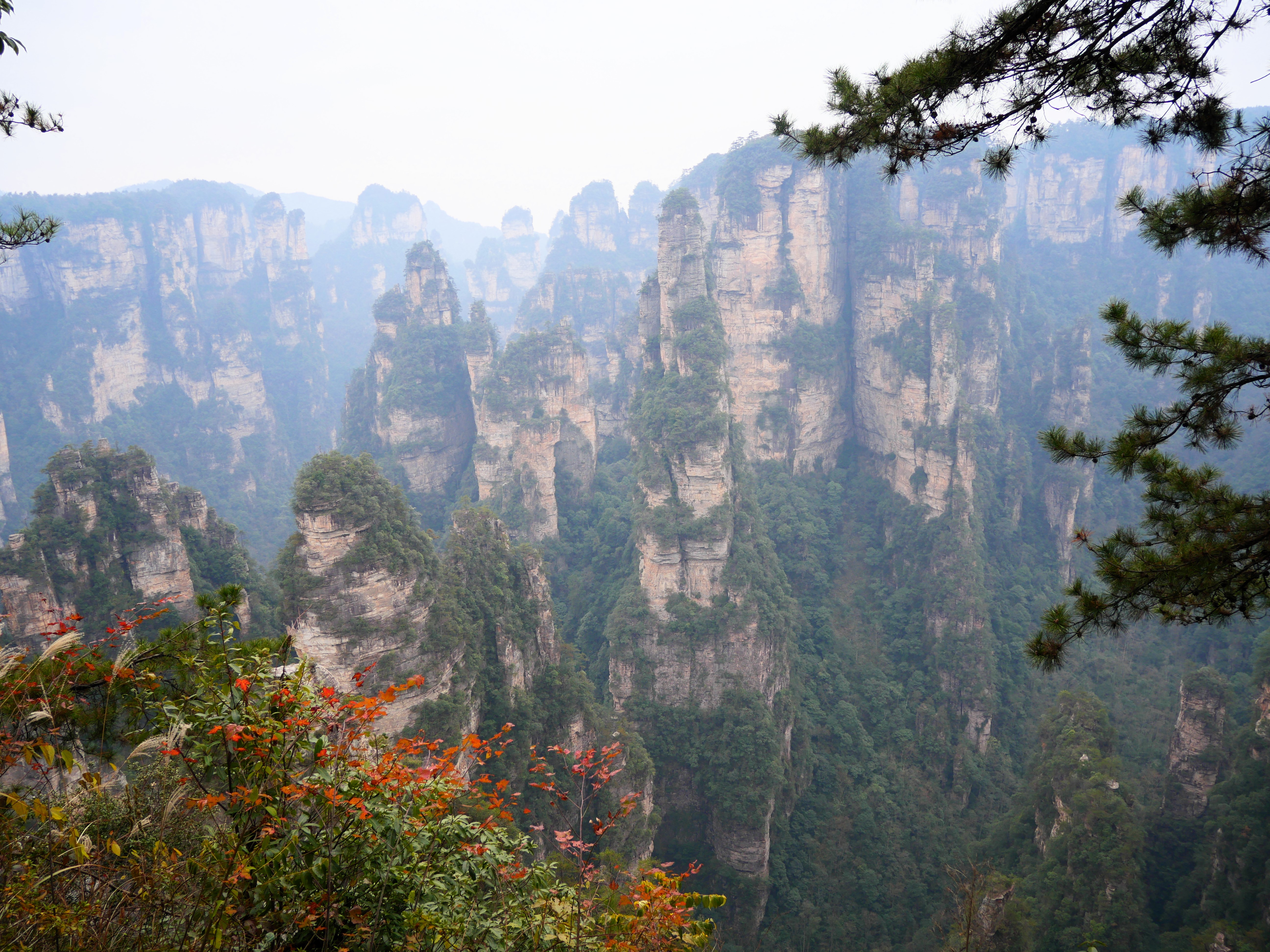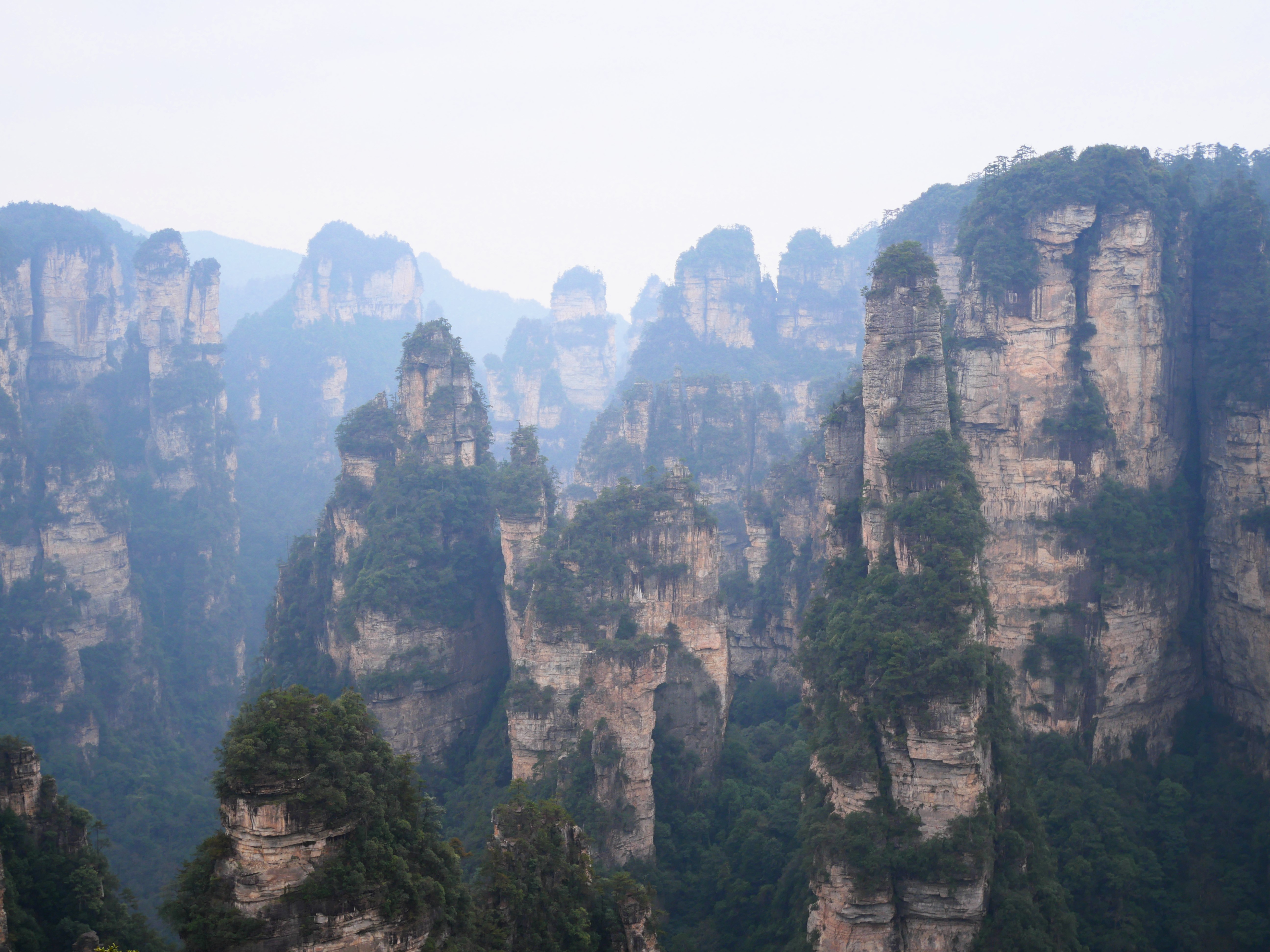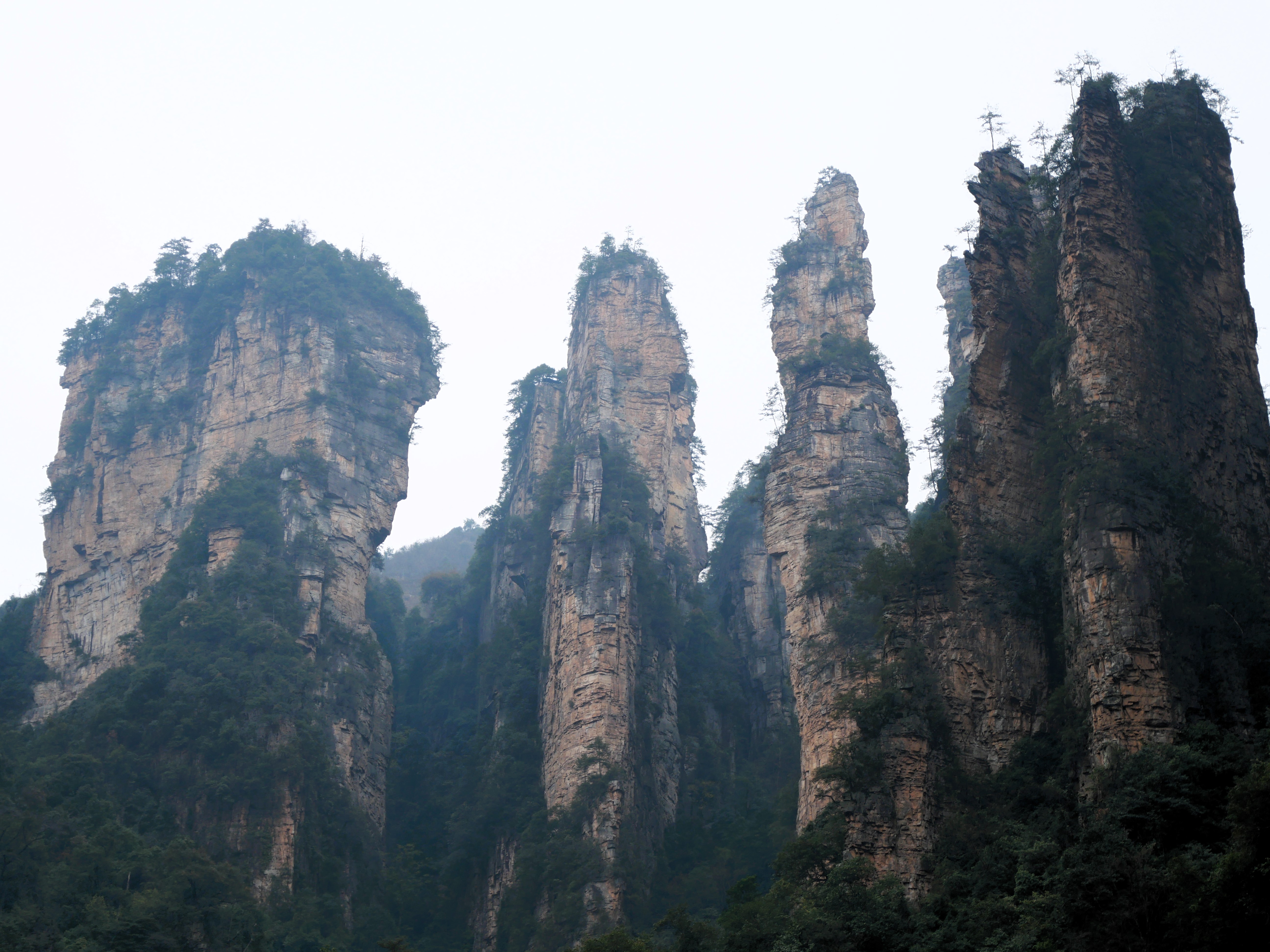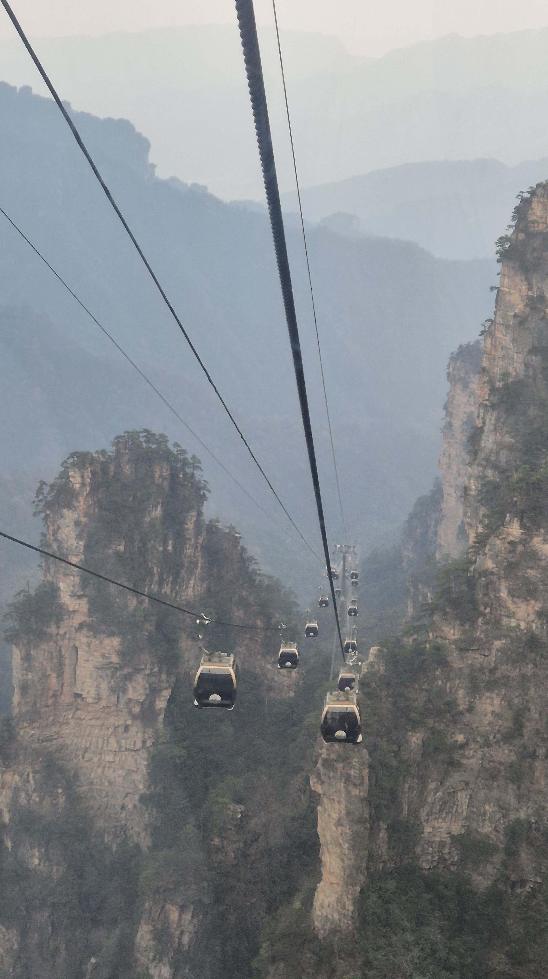 Ya en la parte alta del parque hay de nuevo rutas de camioncitos y caminitos en el acantilado y otras rutas de hike y actividades varias -se ve que la comunidad vive ahí arriba y hay cachos del bosque que se usan para agricultura y ahí están sus pobladíos. Aquí es donde vale la pena dedicar más tiempo, las vistas de los acantilados y los pilaress son, de verdad, de fuera de este mundo. Fui recorriendo varios puntos, siguiendo en su mayoría las recomendaciones de la chica del hotel, pero agregué un par más. Les dejo las fotos porque es difícil describirlo. Y al final del recorrido -bueno, del que yo hice, no todos hacen el mismo- hay un teleférico tan impactante como los de Tianmen que te baja de la montaña para tomar un camioncito más que te deja en la entrada. El parque está pensado para visitarse durante varios días -el boleto es de 4 días-, entonces yo solo hice los highlights, pero me imagino que ha de haber unos lugares de locura y alejados de las multitudes para los más aventureros.