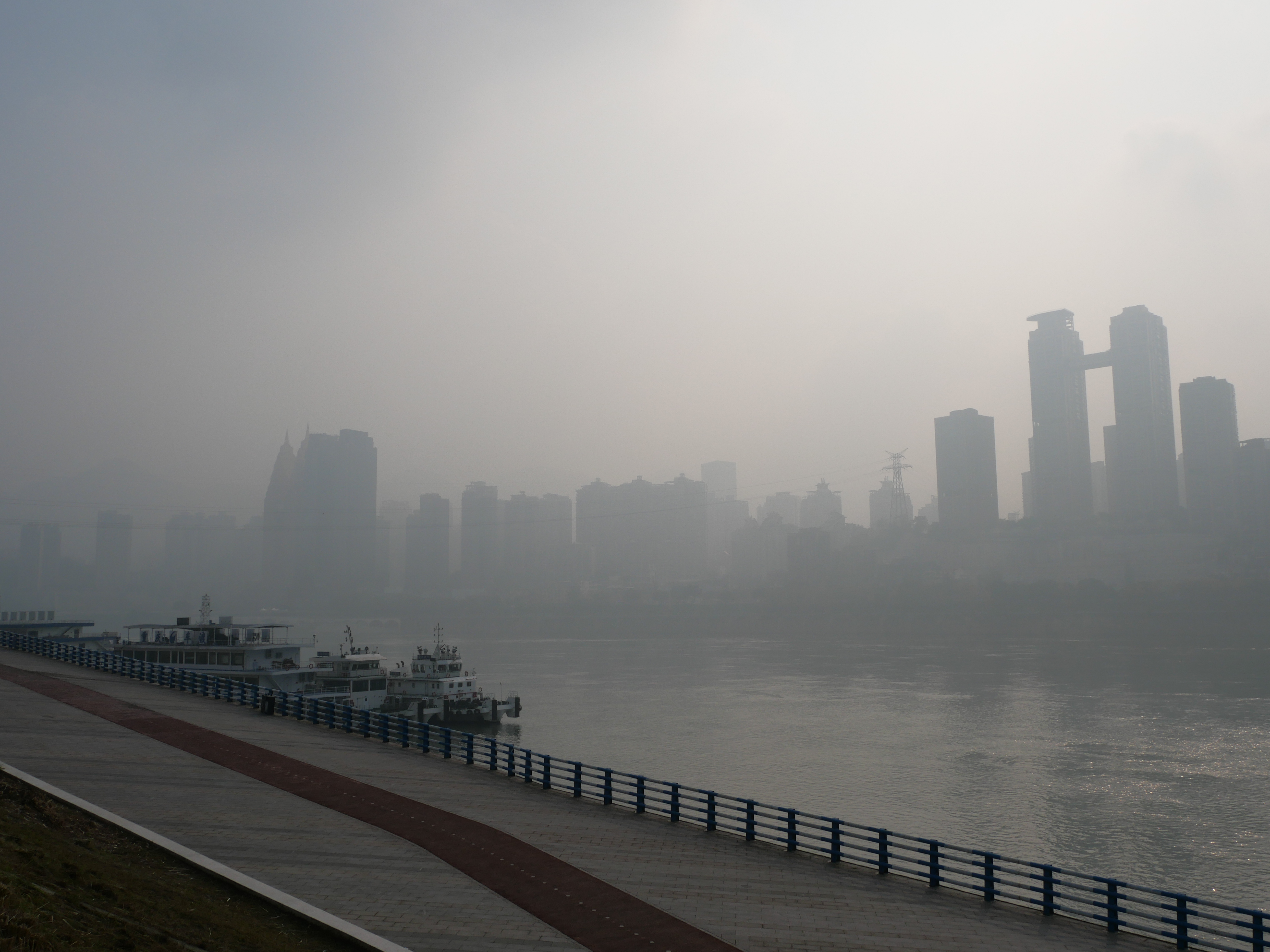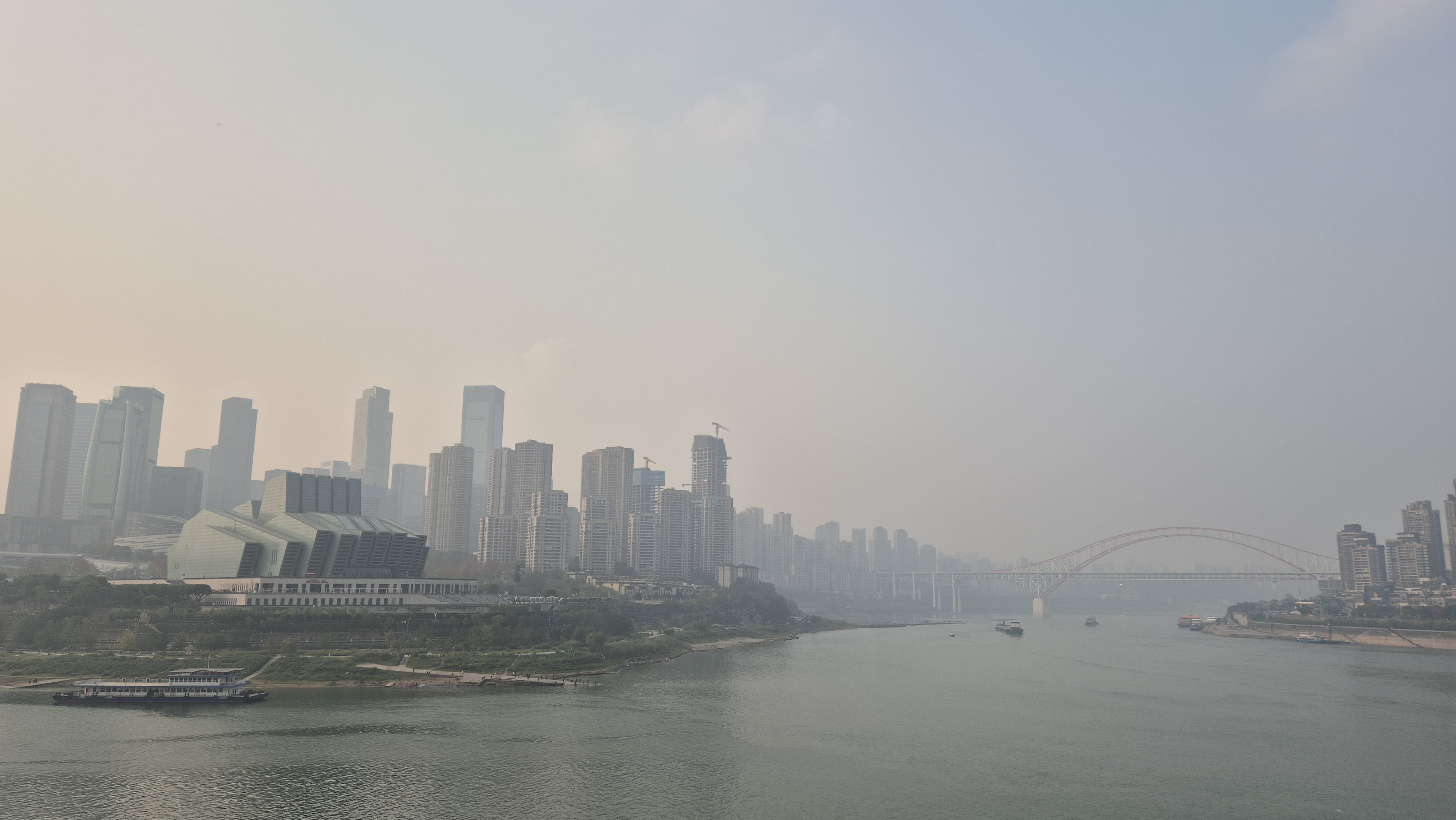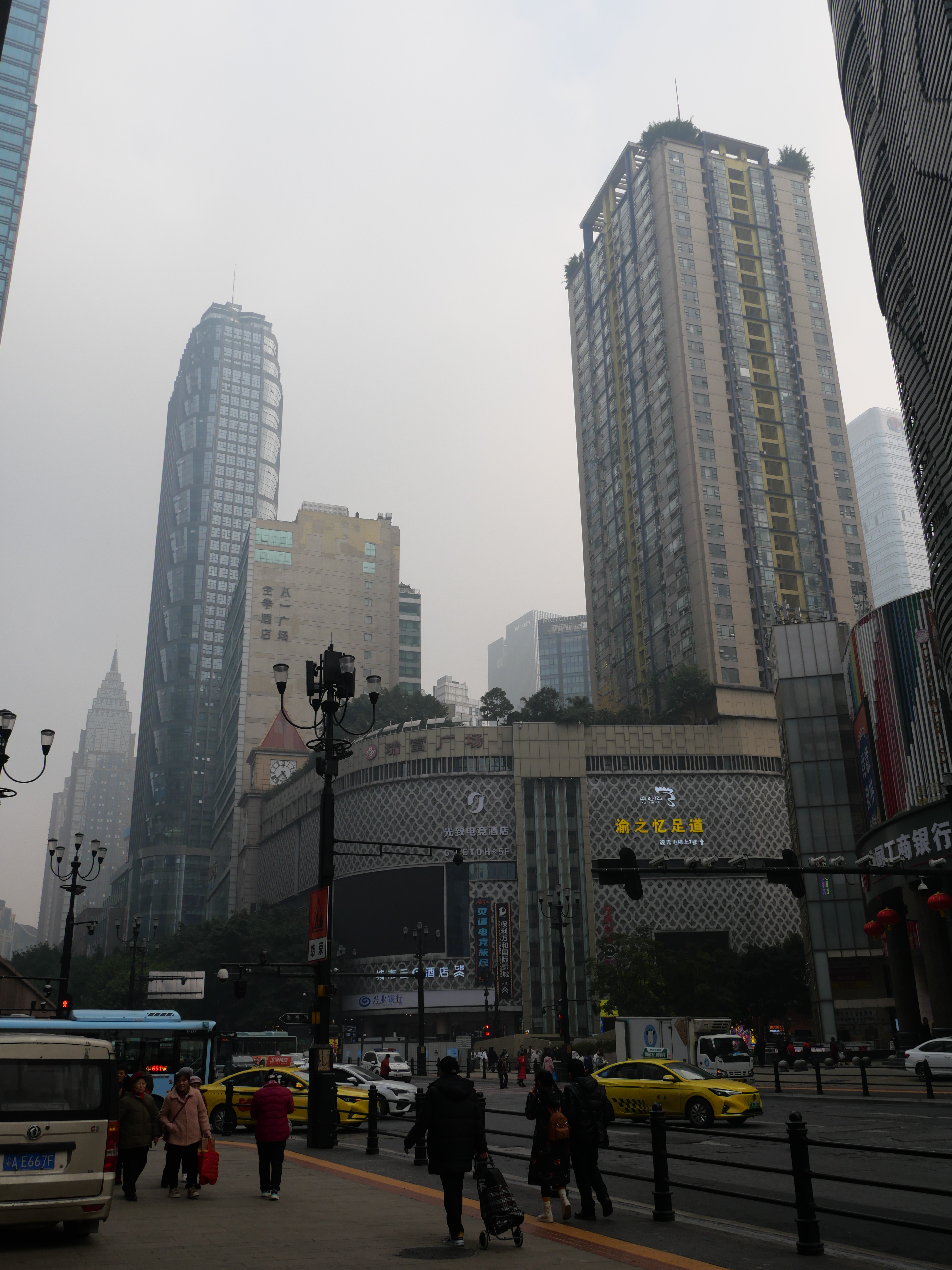 Como acostumbro, no tenía un ruta definida pero sí un destino: quería caminar hacia Chaotianmen Square, donde se encuenta el edificio icónico de Raffles City y es el punto de la península en el que confluyen los dos ríos. Saliendo de Huguang Hall seguí recorriendo calles y escaleras que me llevaron por distintas zonas residenciales y comerciales; llegué a una zona más mercadosa, que estuve explorando un rato y donde entré a un centro de venta de ropa – no me quedó claro si era puro retail o también al mayoreo- con cientos de tiendas en 10 pisos. Una locura -pero no me animé a comprar nada-. En Chongqing, a diferencia de Shanghái, sí se ven dinámicas urbanas más desordenadas y caóticas (hay algo más de pobreza, vida de tianguis, perringos por doquier -no callejeros pero ahí medio hangeando- y ruido). Finalmente llegué a mi destino, el día ya se había aclarado un poco, porque la mañana había estado súper neblinosa (también está bastante contaminado, no les voy a mentir) y se veía hermoso: los dos ríos con la ciudad infinita atrás.