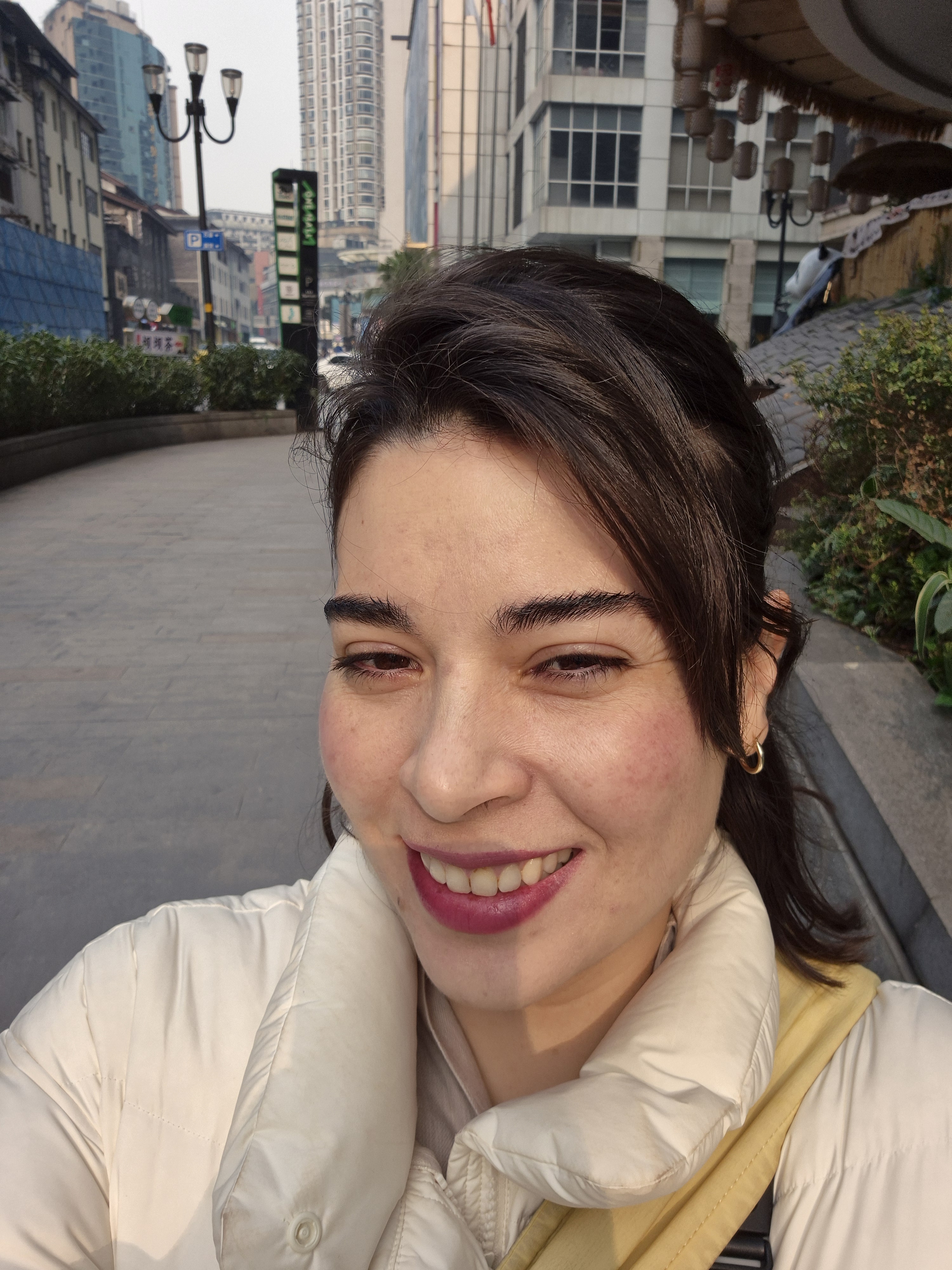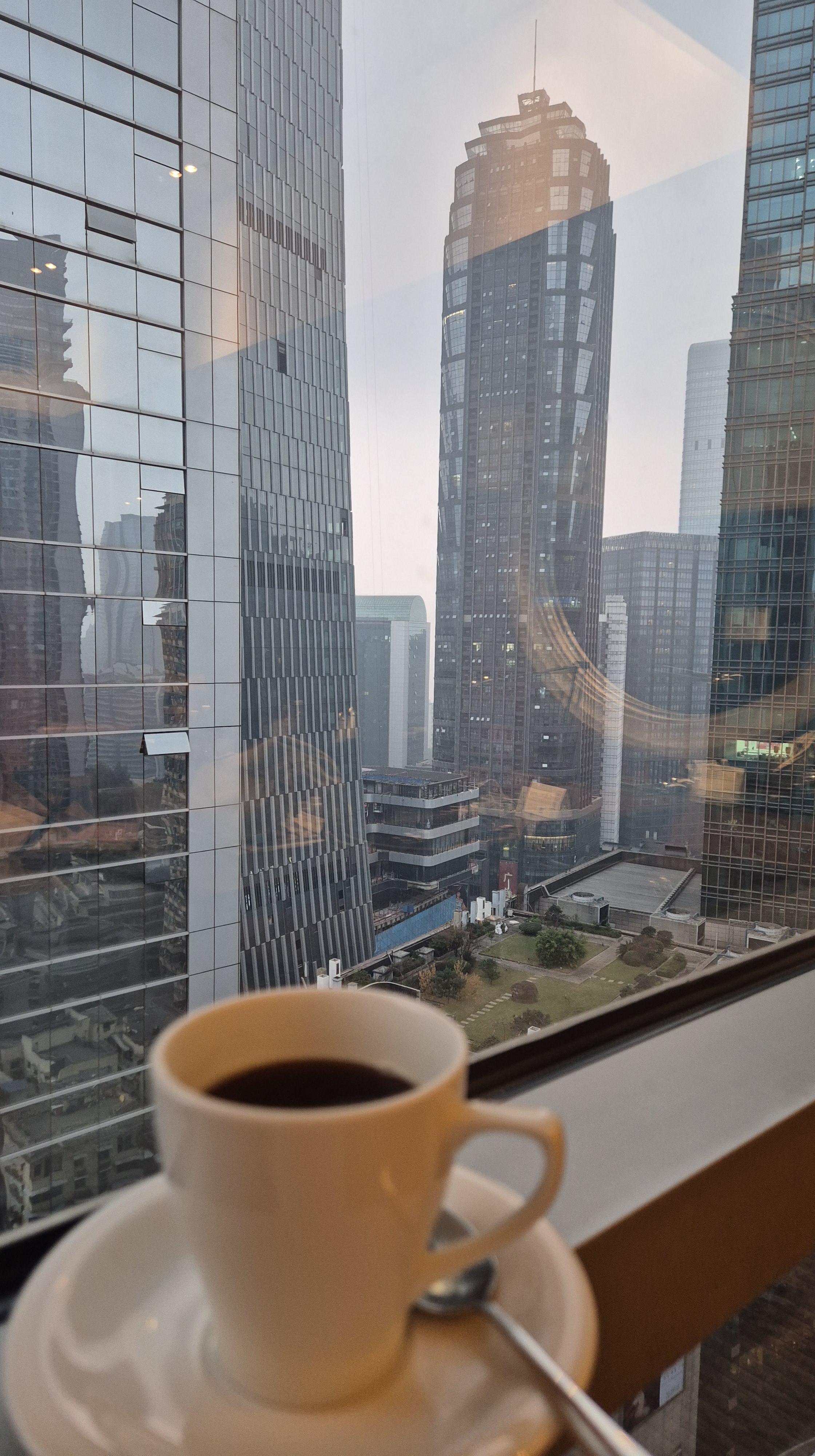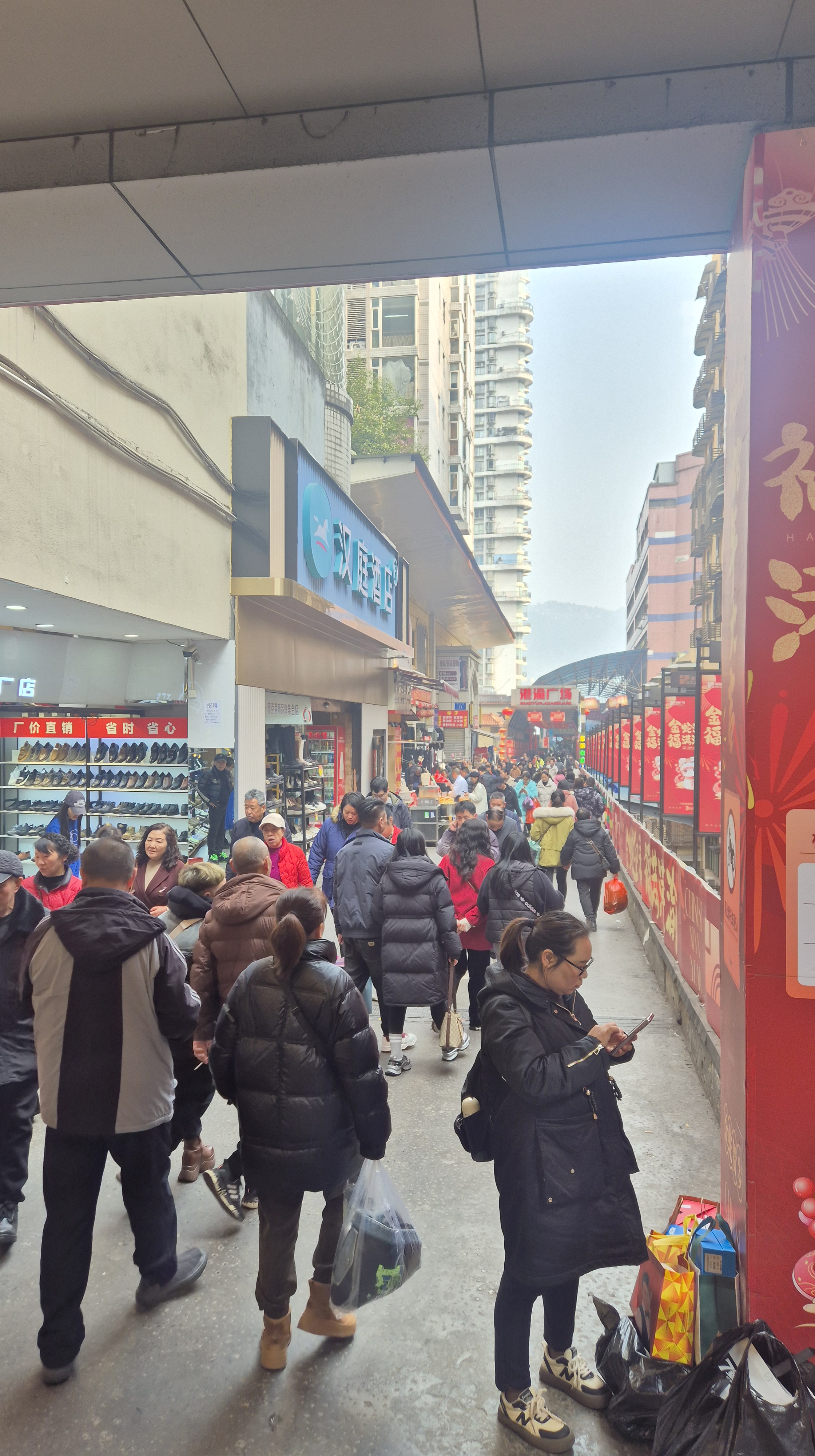 Como acostumbro, no tenía un ruta definida pero sí un destino: quería caminar hacia Chaotianmen Square, donde se encuenta el edificio icónico de Raffles City y es el punto de la península en el que confluyen los dos ríos. Saliendo de Huguang Hall seguí recorriendo calles y escaleras que me llevaron por distintas zonas residenciales y comerciales; llegué a una zona más mercadosa, que estuve explorando un rato y donde entré a un centro de venta de ropa – no me quedó claro si era puro retail o también al mayoreo- con cientos de tiendas en 10 pisos. Una locura -pero no me animé a comprar nada-. En Chongqing, a diferencia de Shanghái, sí se ven dinámicas urbanas más desordenadas y caóticas (hay algo más de pobreza, vida de tianguis, perringos por doquier -no callejeros pero ahí medio hangeando- y ruido). Finalmente llegué a mi destino, el día ya se había aclarado un poco, porque la mañana había estado súper neblinosa (también está bastante contaminado, no les voy a mentir) y se veía hermoso: los dos ríos con la ciudad infinita atrás.