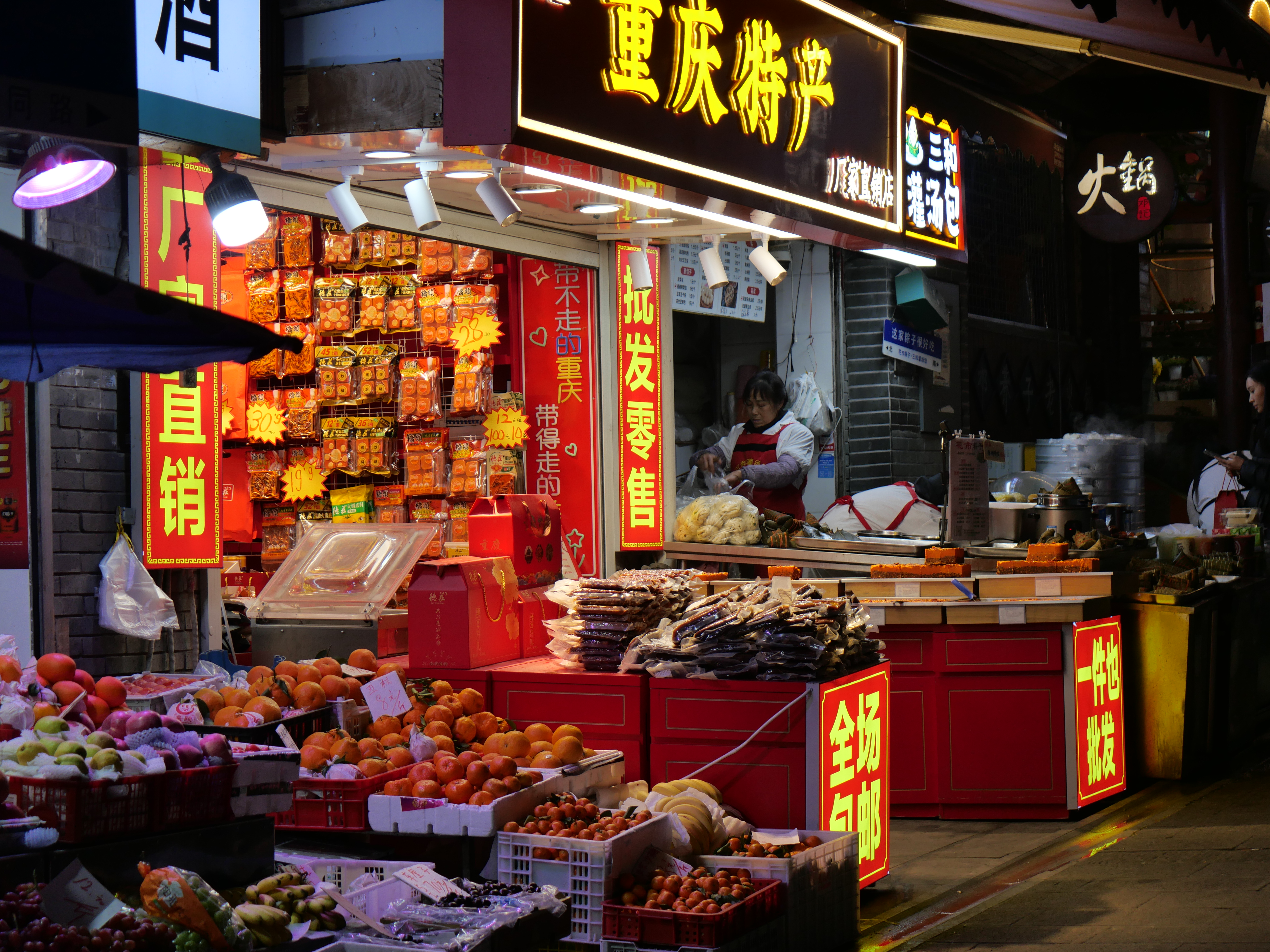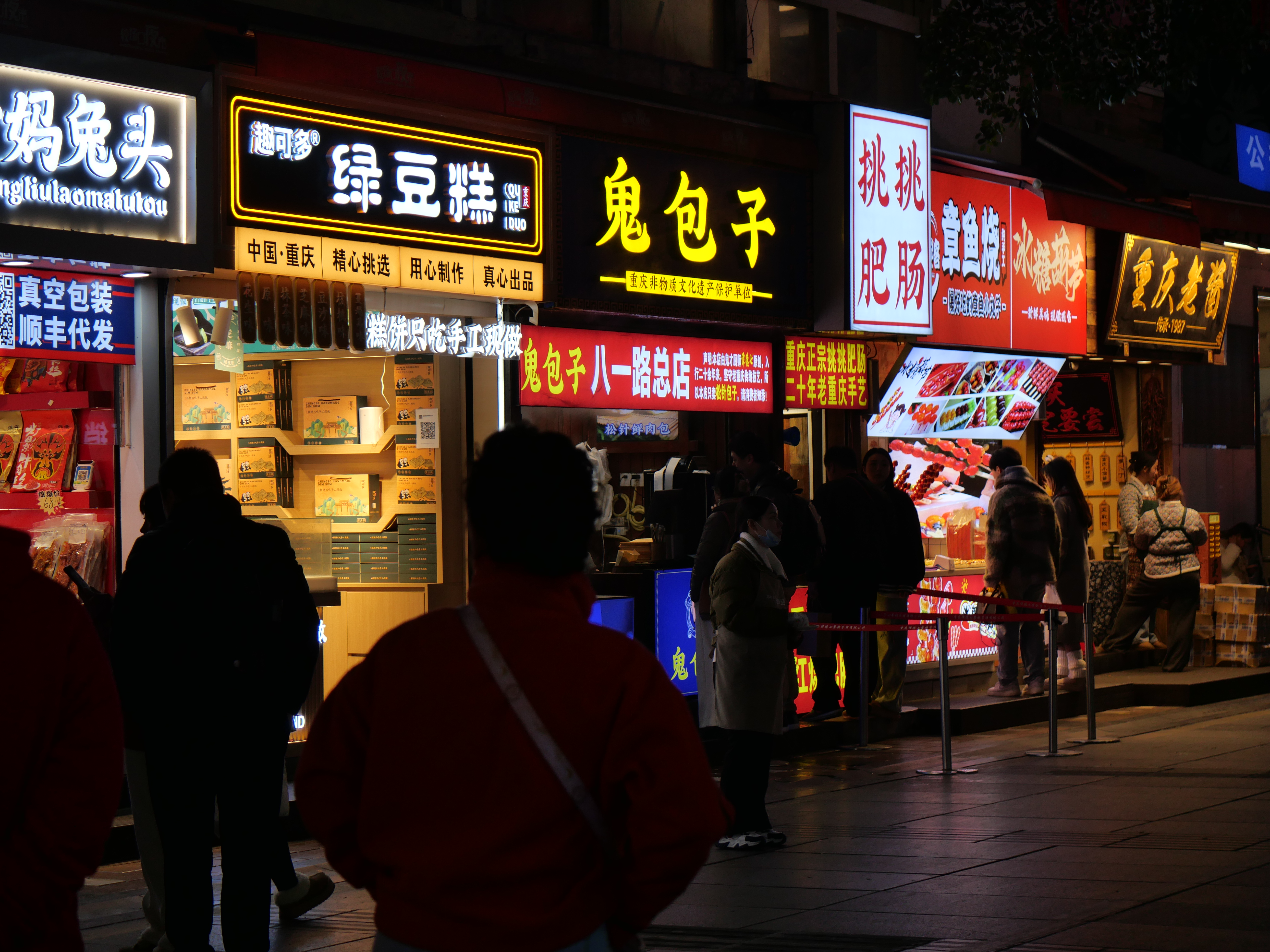 En mi primera noche, visité el área comercial fancy y recorrí las calles de puestos de comida, llenos de locales y turistas paseando y disfrutando la gastronomía local, ahí me cené unos noodles de Chongqing -deliciosos y picosos y con muchísima pimienta de Sichuán-.
