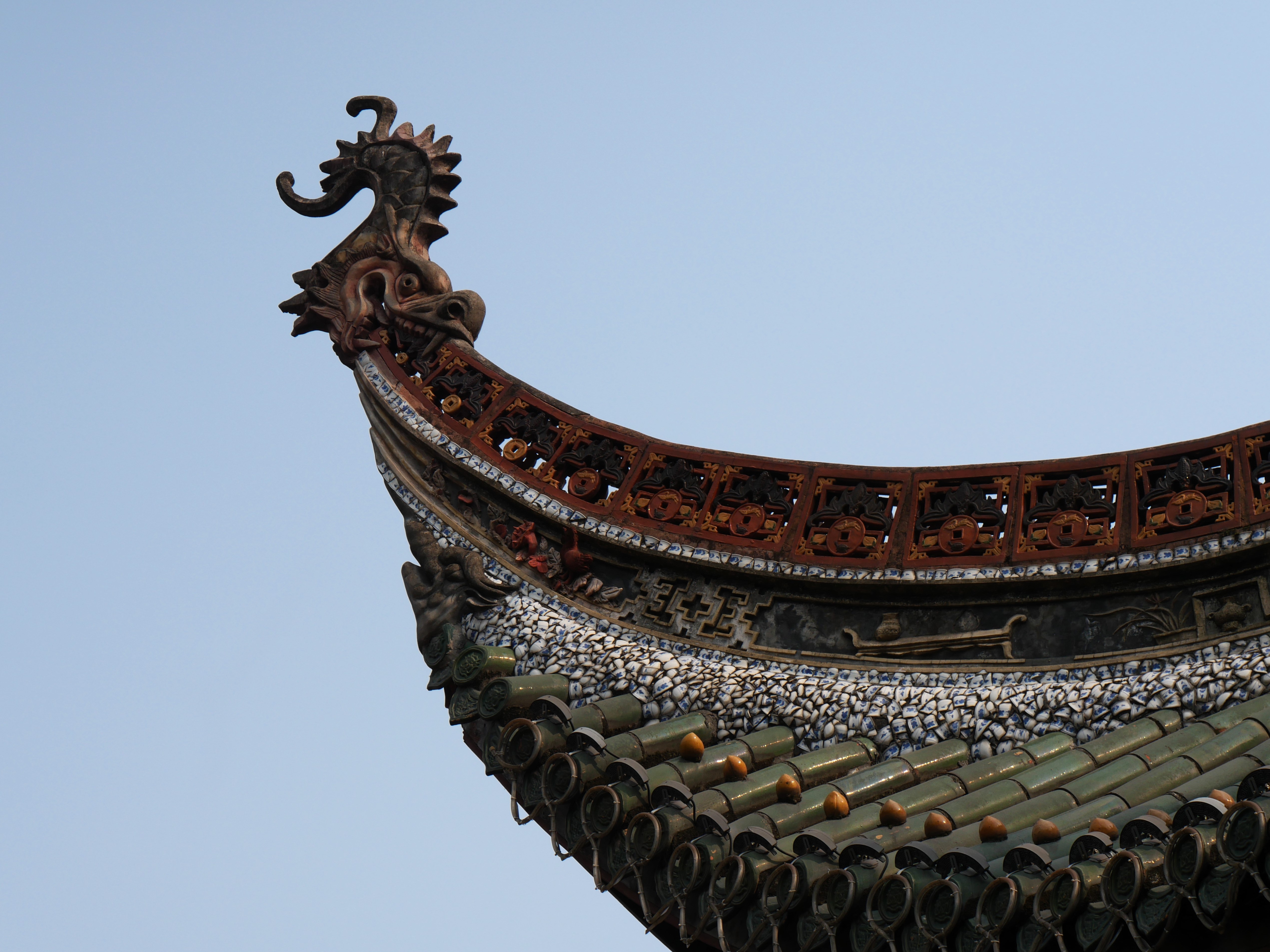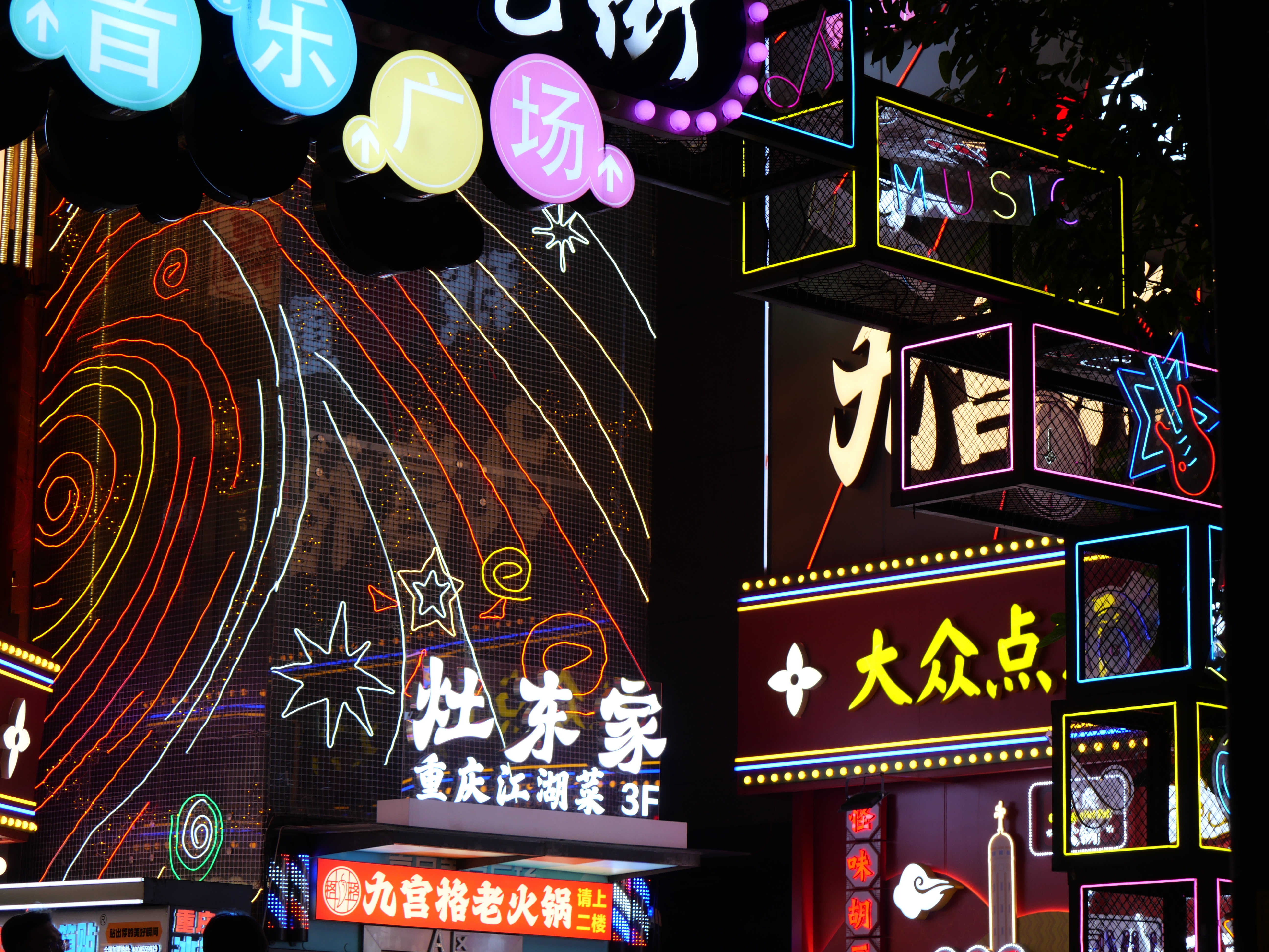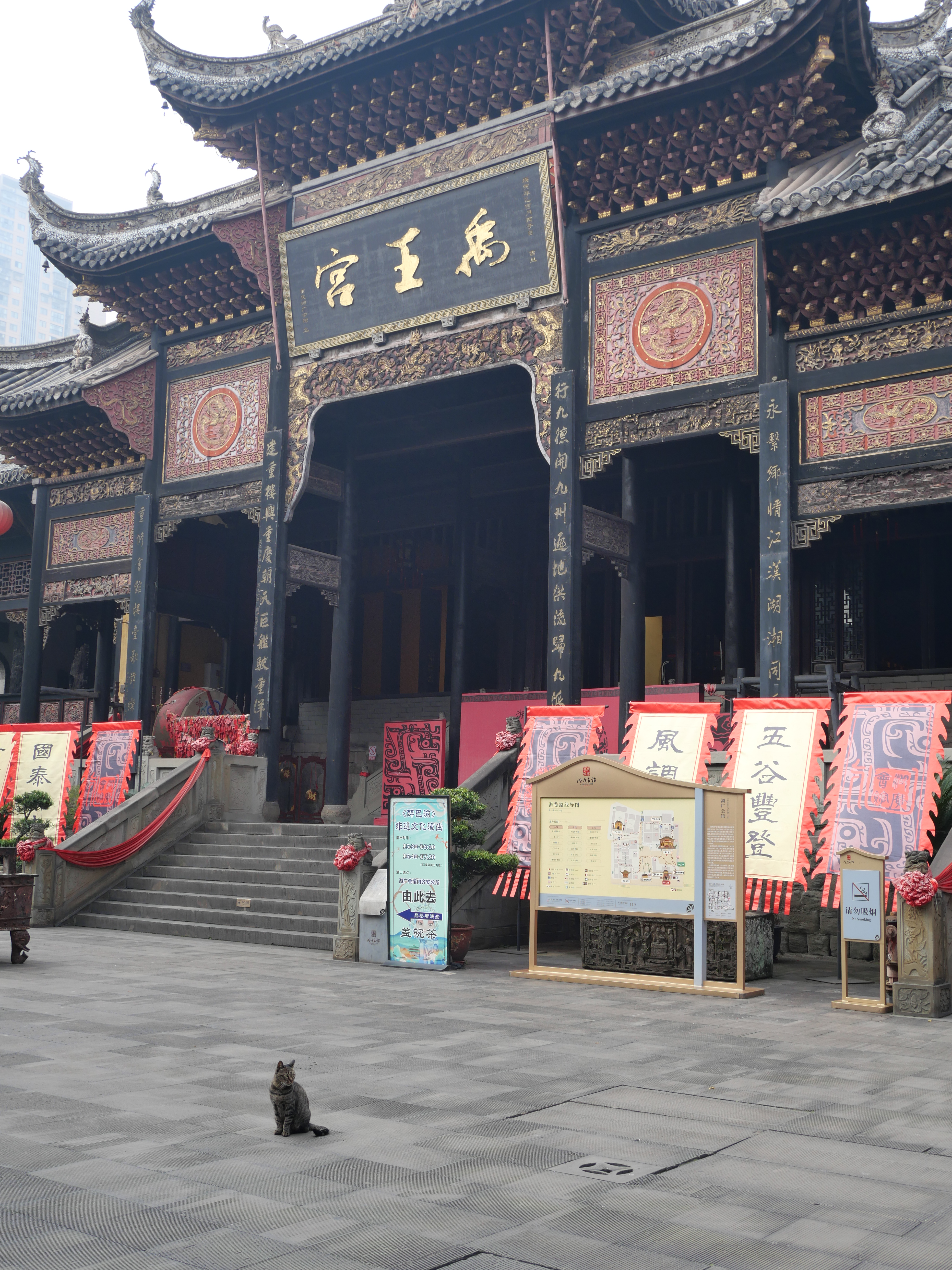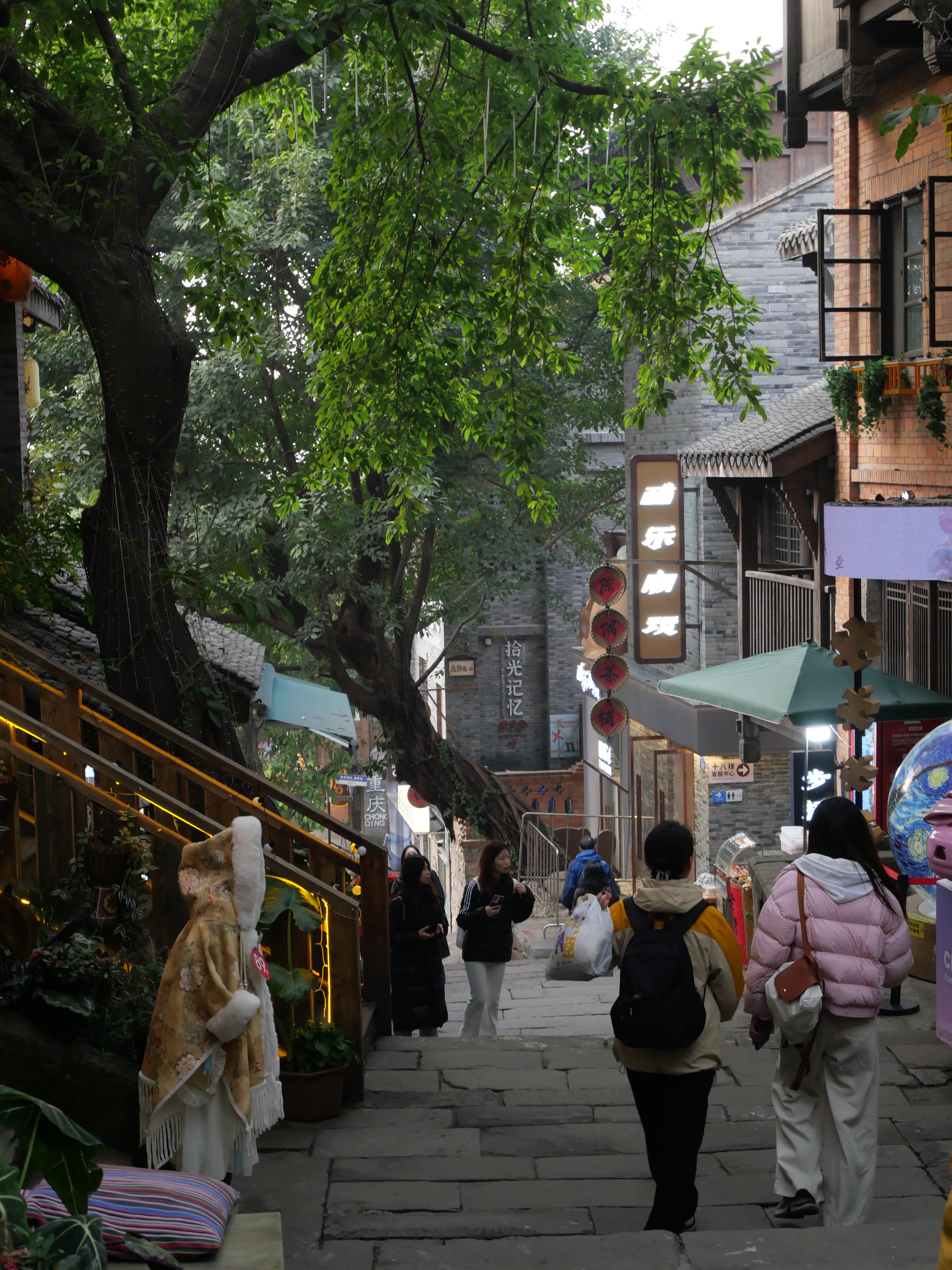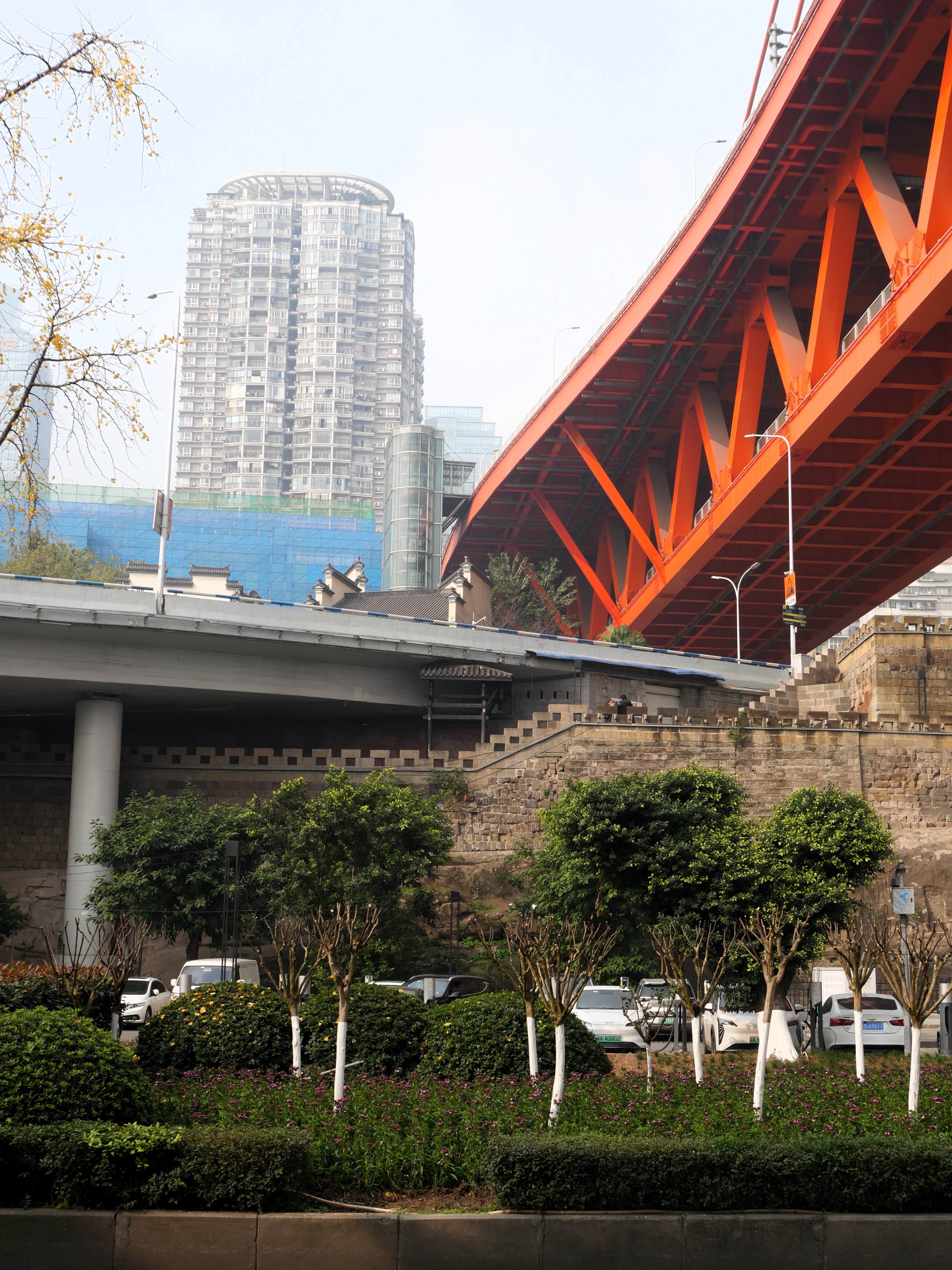 Mi primer día me salí a recorrer la zona cercana a mi hotel. Caminé por varias calles y cientos de escaleras que finalmente me llevaron a un paseo por el río. El paseo me llevó al puente Qiansimen, uno de los más icónicos de la ciudad y de ahí a Huguang Guild Hall, un edificio antiguo bastante importante -y hermoso- que quedó conservado entre puentes, segundos piso y avenidas. Es verdaderamente impresionante cómo aprovechan todos los espacios para meter infraestructura y servicios en esta ciudad.