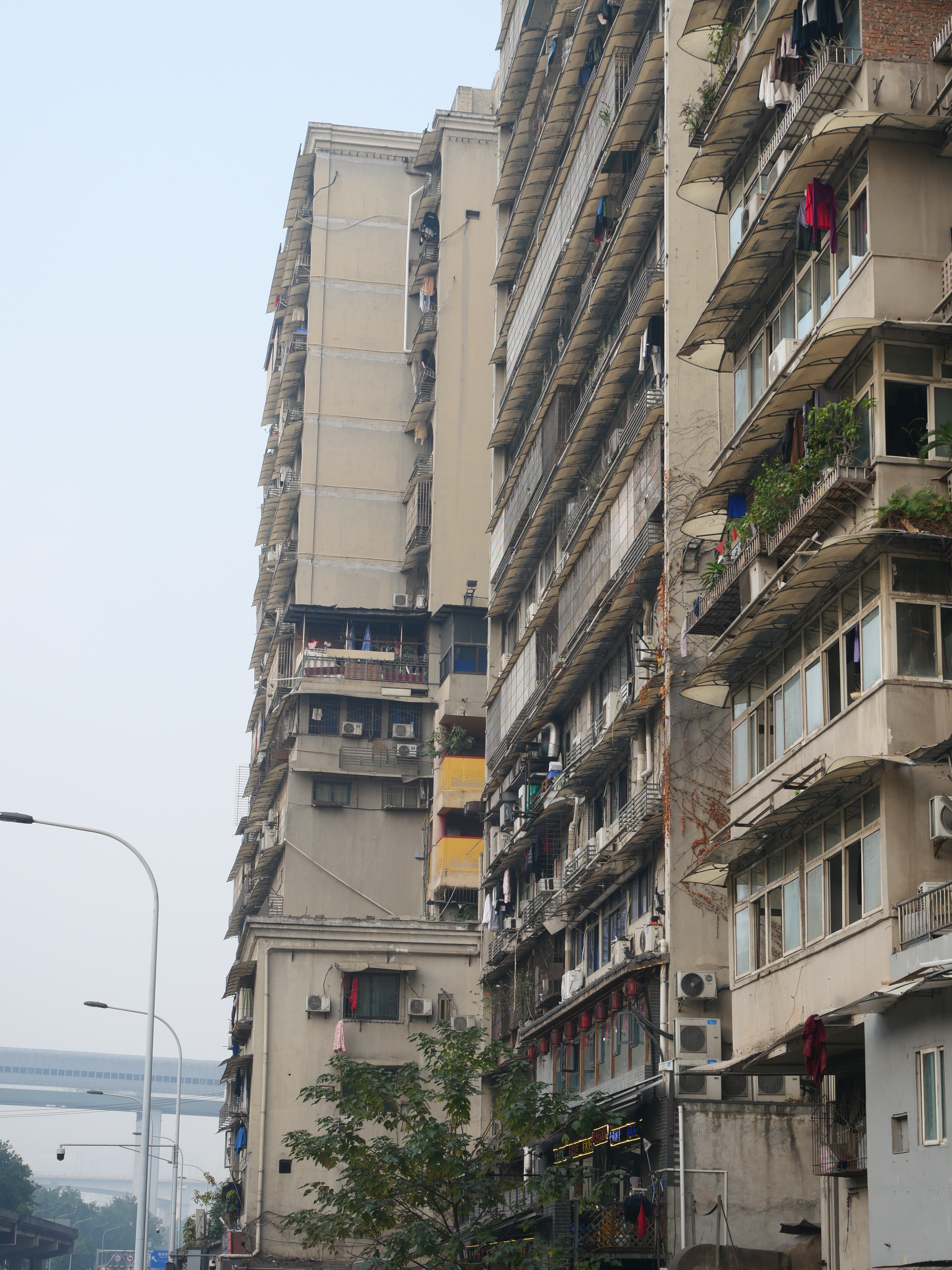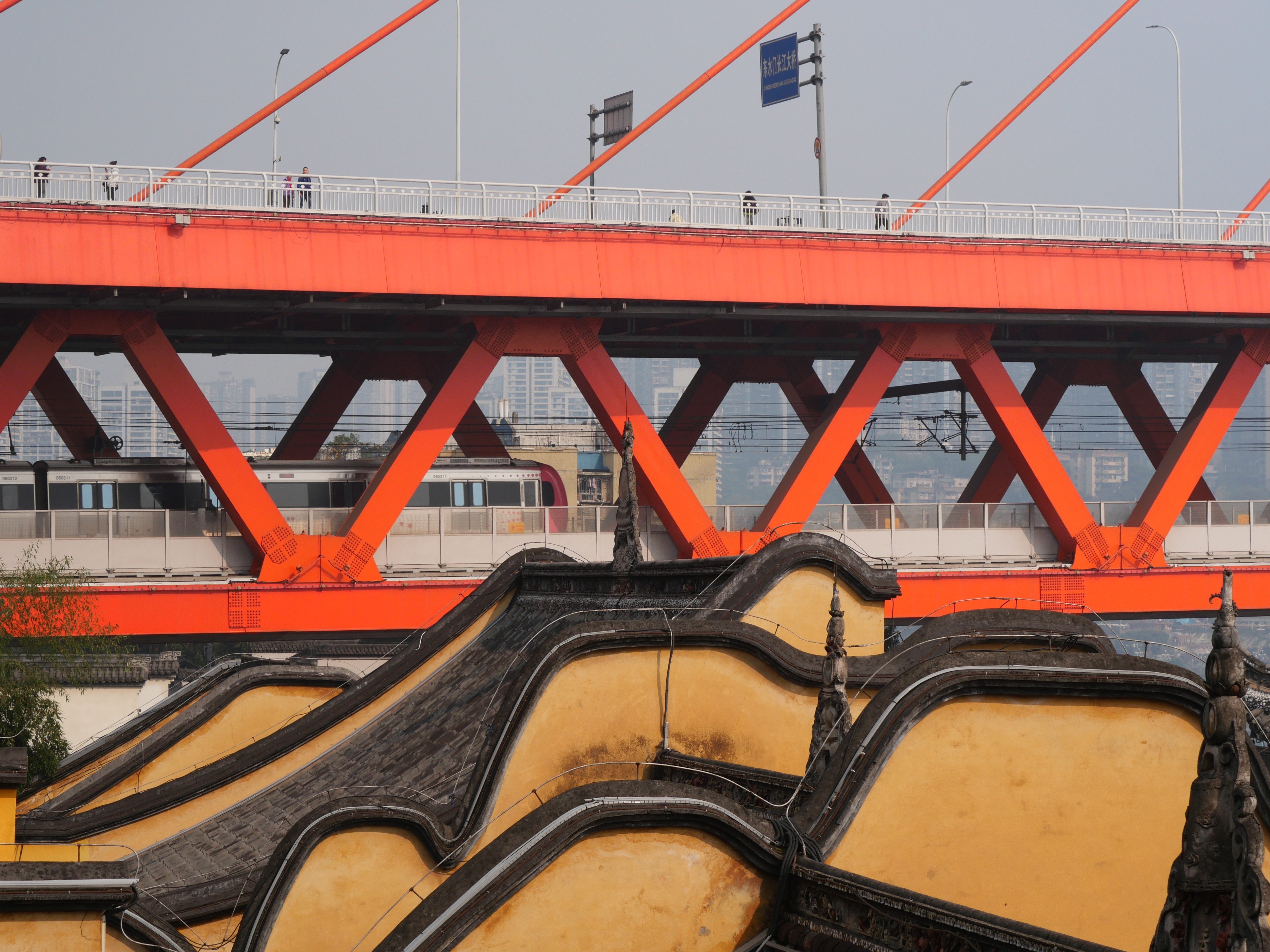 Otra cosa interesante de Chongqing es su orografía, es verdaderamente colinuda y han desarrollado la ciudad para aprovechar esto: sus edificios, transporte público, infraestructura, plazas y parques en vez de huirle a las colinas, las usan a su favor. Puedes subir una calle, creyendo que llegarás a un punto alto de la ciudad para darte cuenta que tienes que volver a bajar para volver a subir y así, al infinito. Nunca estás seguro de si es para arriba o para abajo, lo que la hace extremadamente divertida para recorrer: entras por una plaza en la planta baja de un edificio y sales a un parque en el piso 7 del mismo. El metro cruza montañas, ríos y hasta edificios.