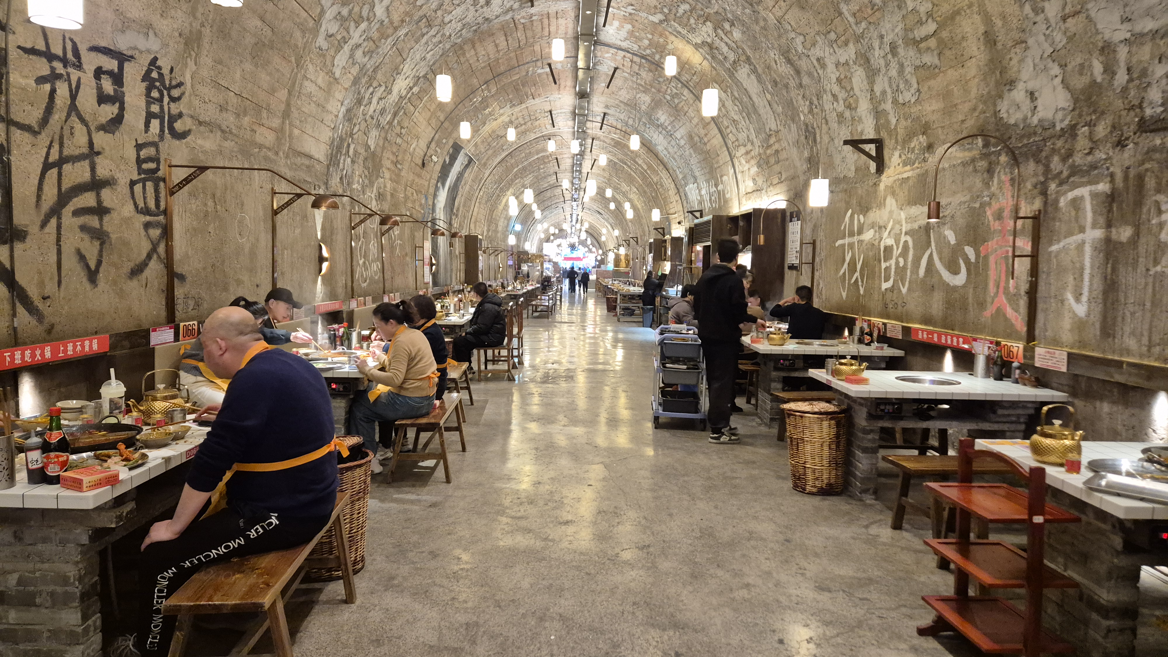 De todos los lugares de hot pot en Chongqing escogí ese porque es un búnker reconvertido en restaurante -lo que lo volvió viral en redes-. Como había platicado, Chongqing fue la capital durante la segunda guerra mundial, y fue fuertemente bombardeada por los japoneses. Para proteger a la gente, construyeron una serie de búnkers entre sus colinas. Ahora, por lo visto, los están reconvirtiendo en distintos espacios. Este restaurante es una locura, son 206 mesas (están numeradas) como en 500 metros de túnel que atraviesa una colina entera. Fui a deshoras, entonces habíamos poquitos en el restaurante, pero se ve que estaban preparados para recibir a todas las mesas a la hora de cenar.