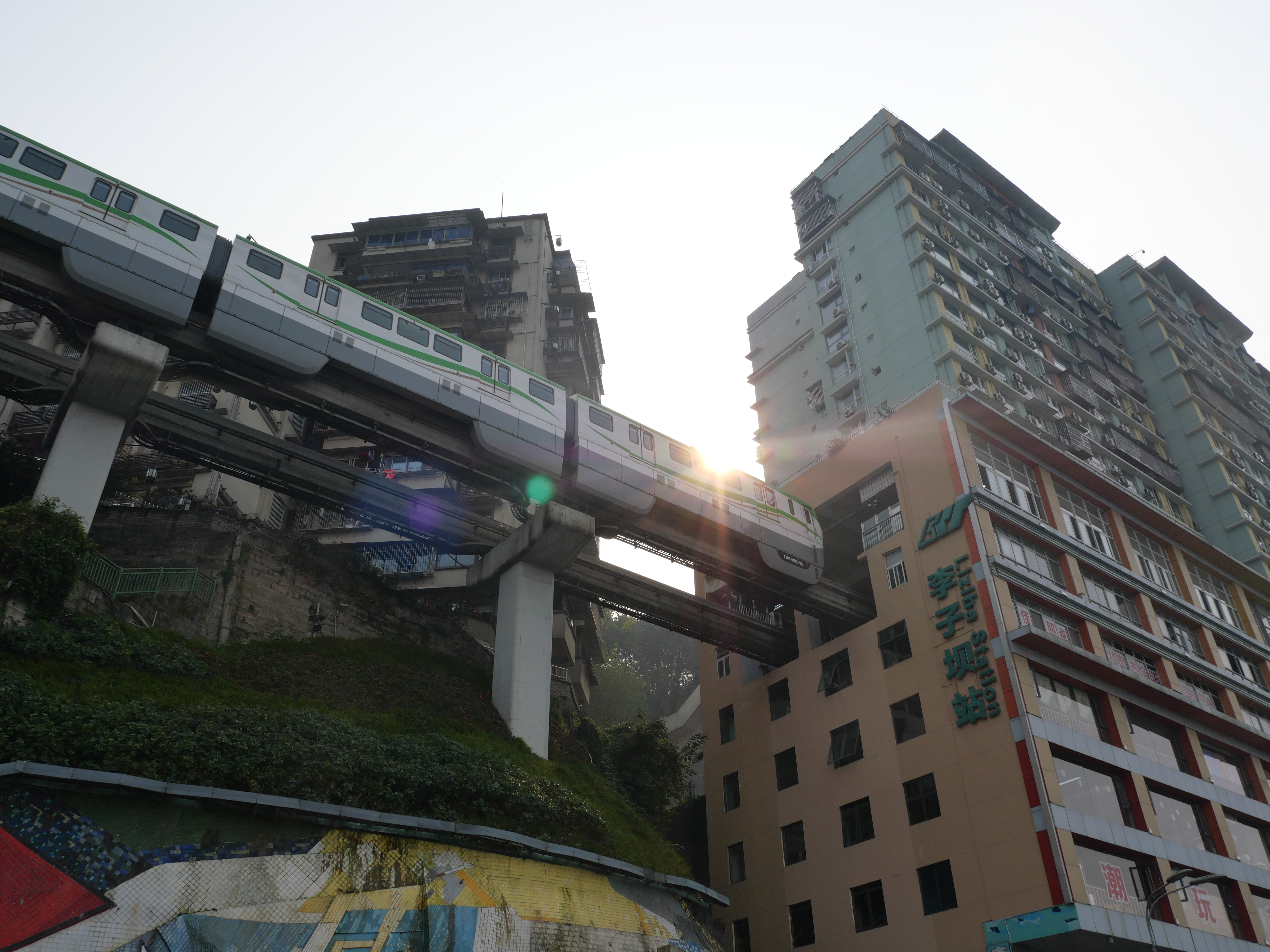 Después de estar un rato en la plaza, que todavía no entiendo cómo cupo entre tanta colina, crucé por una serie de túneles media montaña que me conectaron con una de las líneas de metro -que realmente es un tren elevado en la mayoría de su ruta- más locochonas de la ciudad. Esta línea bordea riberas pegada a los acantilados, cruza montañas a través de largos túneles, se mezcla con autopistas y puentes, y atraviesa zonas densamente pobladas, aprovechando hasta el último metro cuadrado de espacio libre, y en más de un punto ¡cruza entre edificios! Me detuve en la parada Liziba, que ya es una atracción turística a ver uno de esos cruces; de hecho la estación está adentro del edificio, que es en parte comercial y más arriba residencial. De locos.