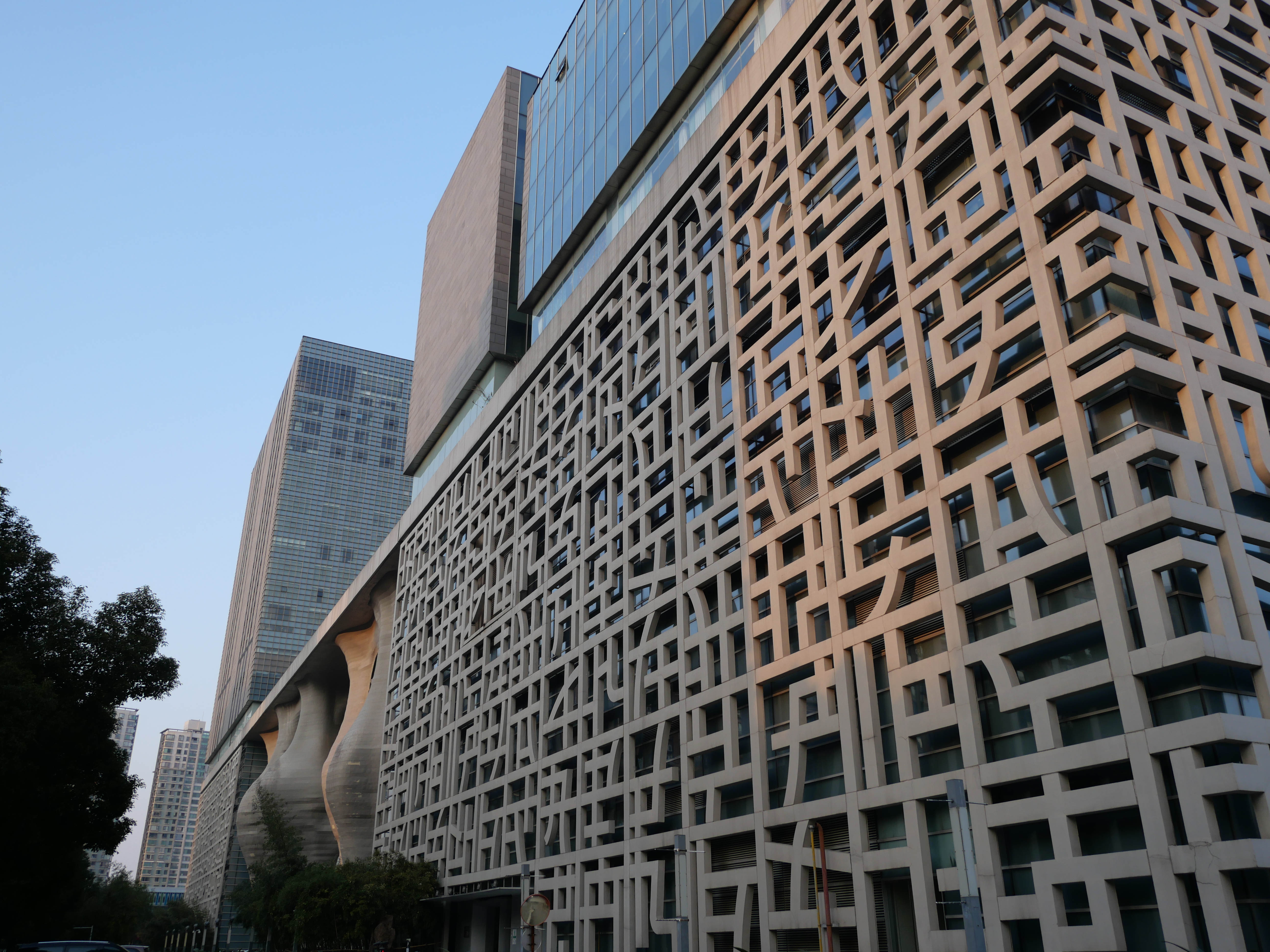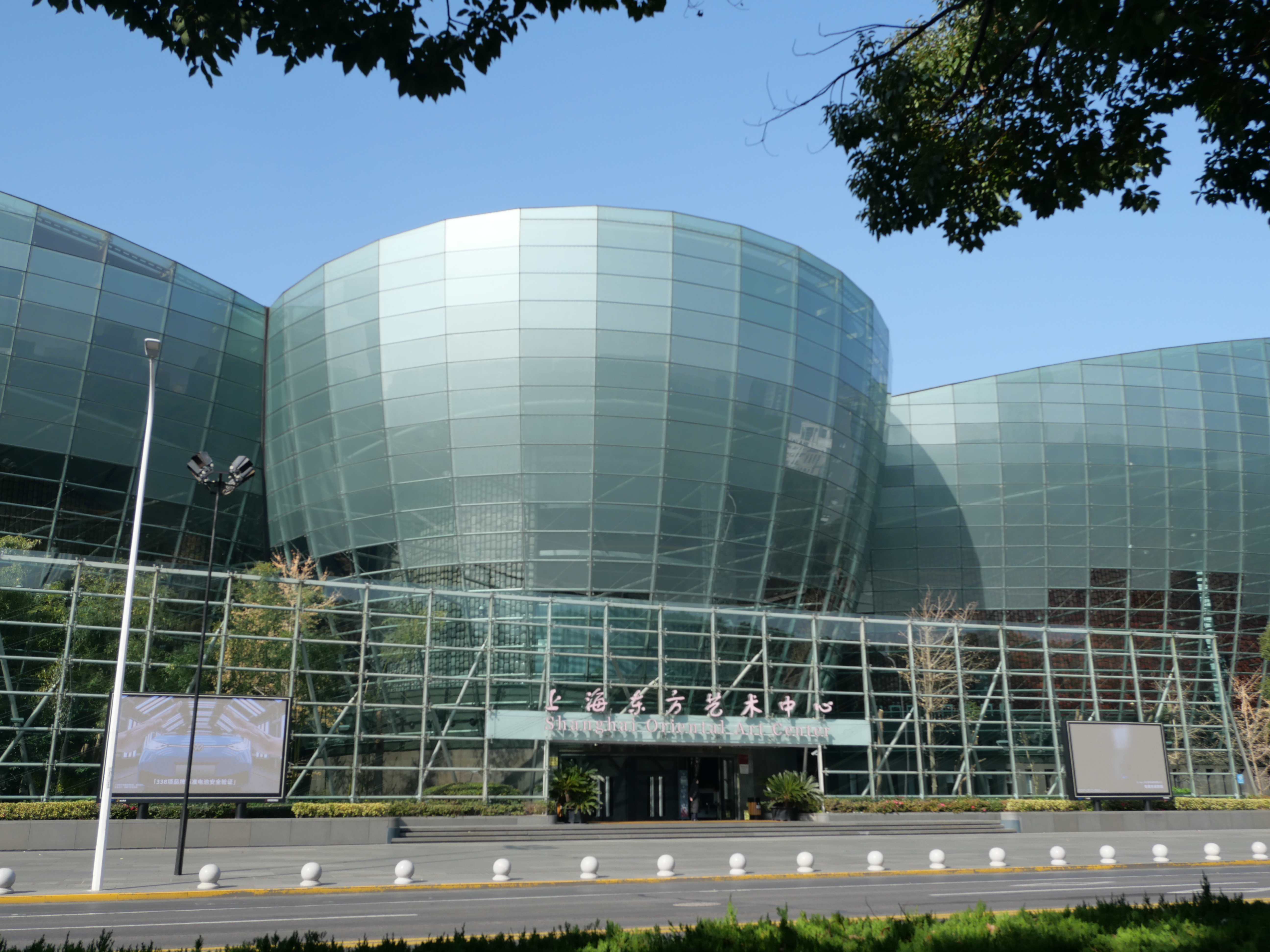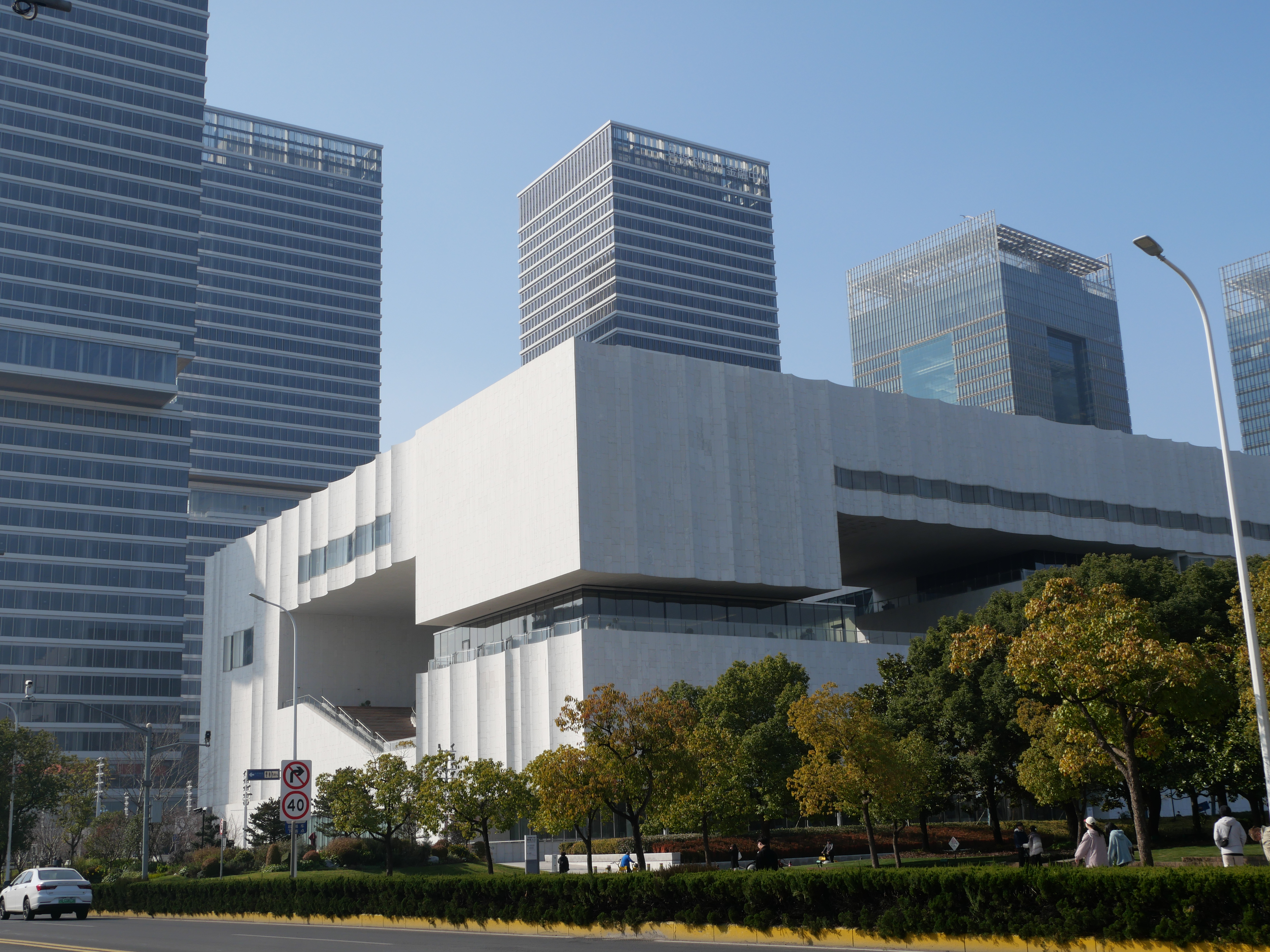 Como siempre, llegué sin saber qué esperar. Salgo de la estación de metro y me encuentro con una plaza enorme y hermosa, rodeada de jardines entre los que se medio escondían todos estos imponentes edificios, al fondo grandes edificios de oficinas y más al fondo los rascacielos de Pudong. Me llamó la atención un edificio increíble que, de todos los que veía, era el único que no tenía mapeado.